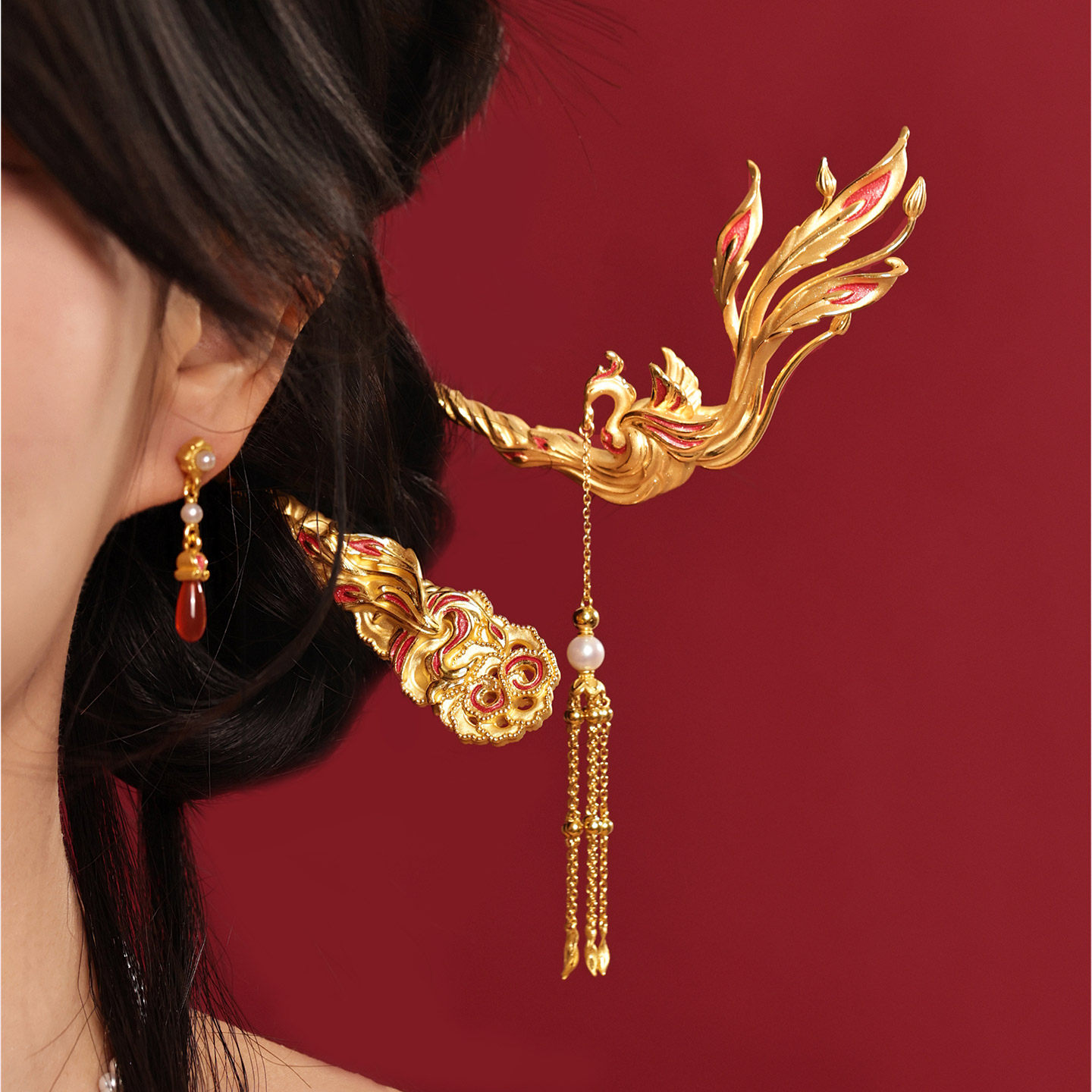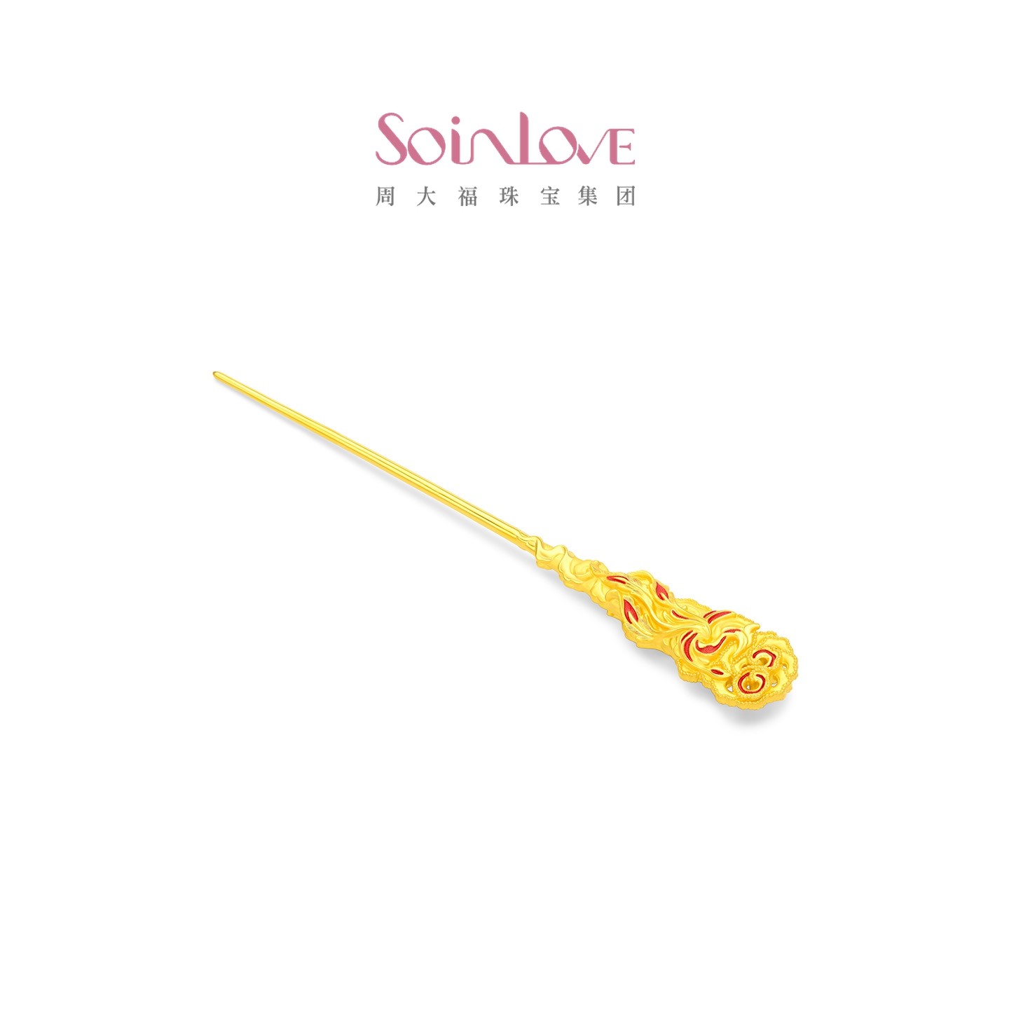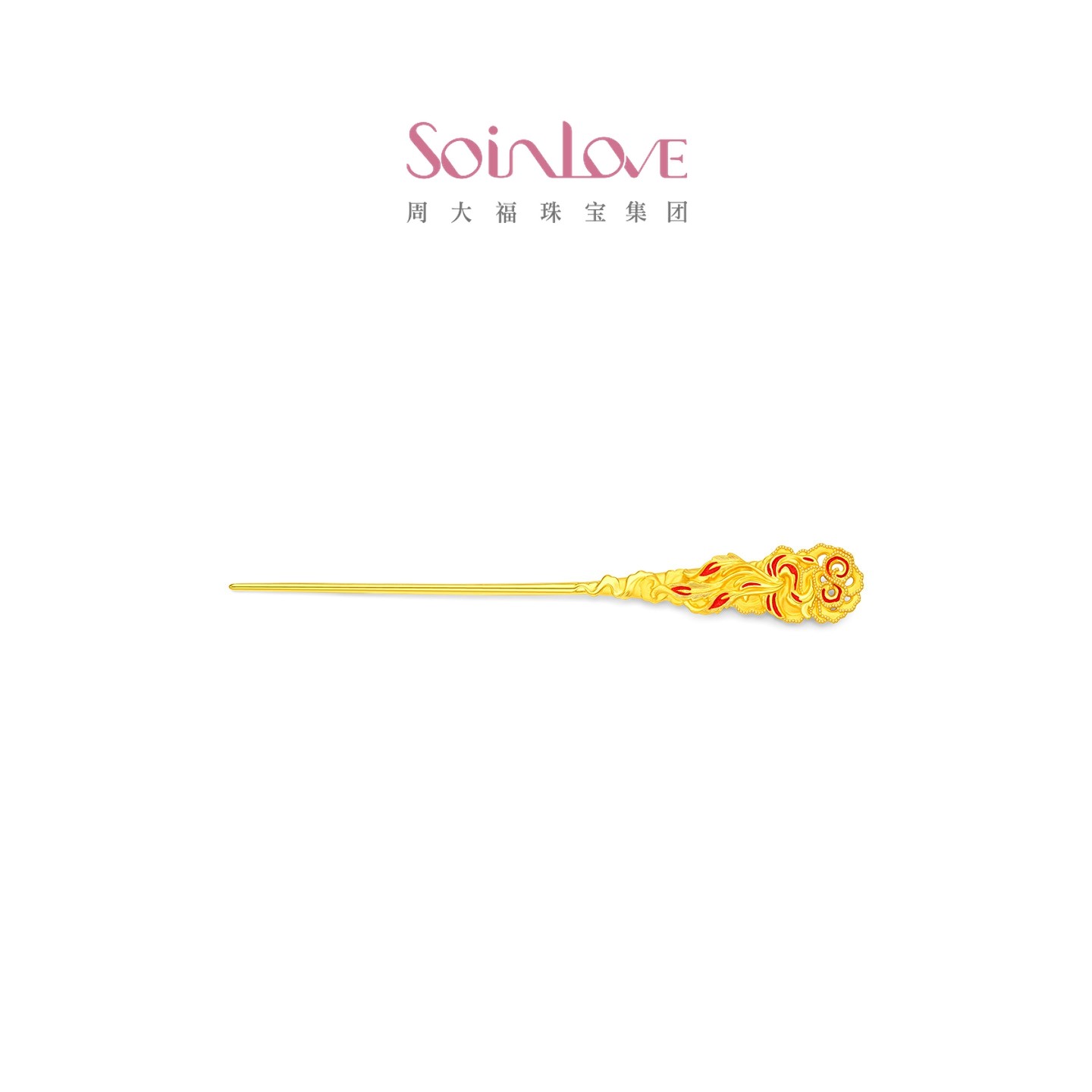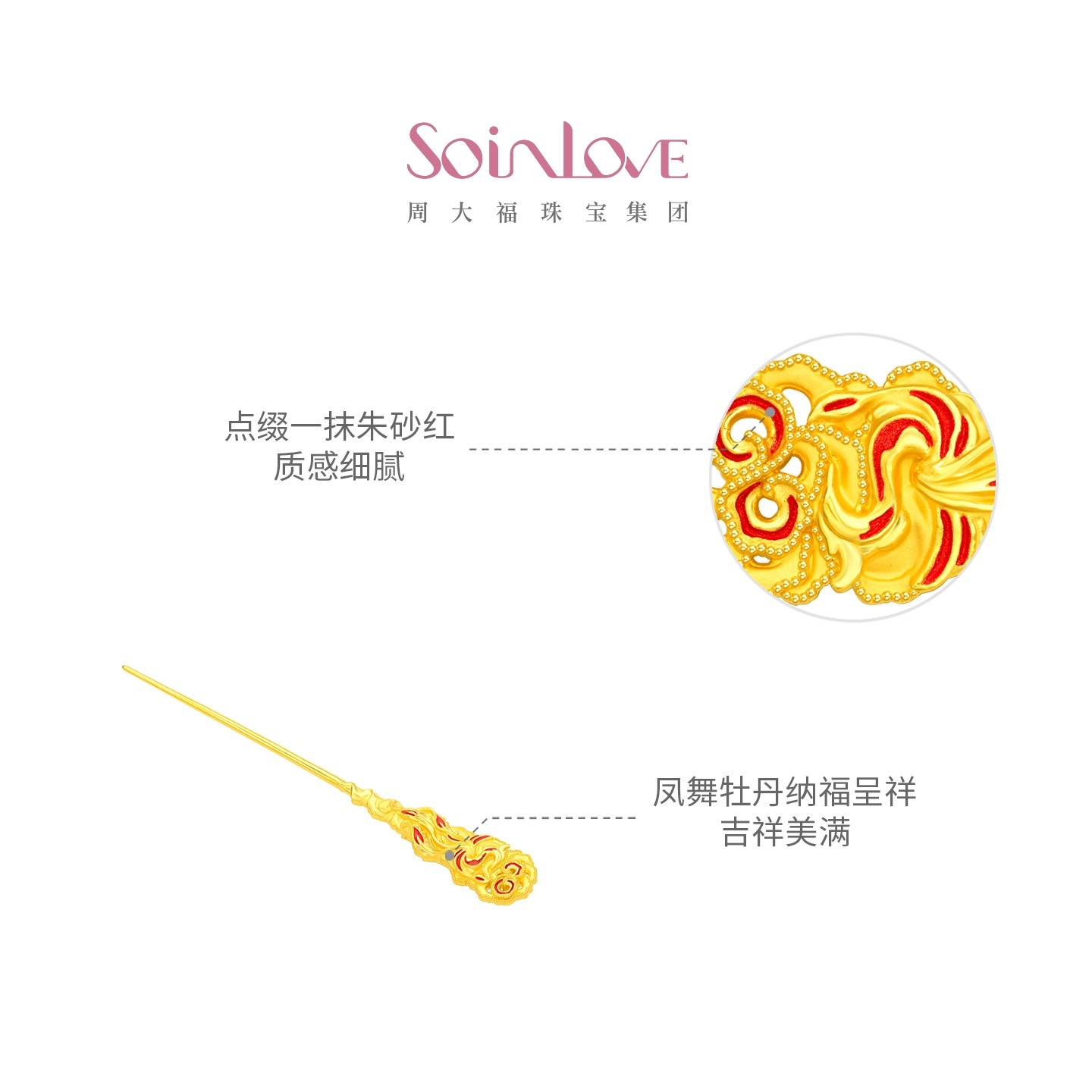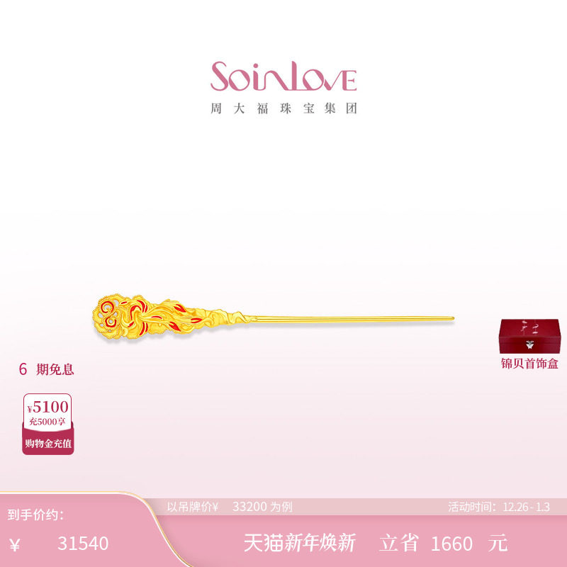 周大福SOINLOVE 蜜粉金十里红妆中式婚嫁凤穿牡丹黄金发簪送礼