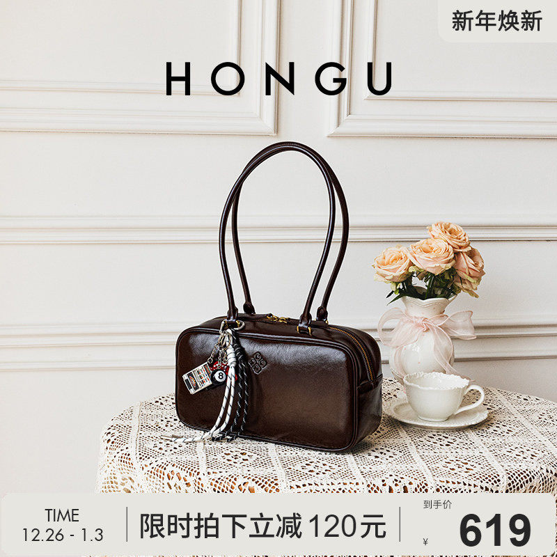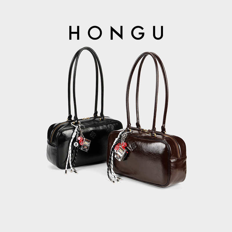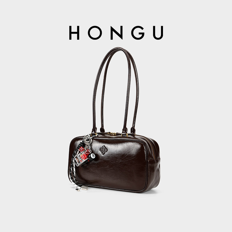 红谷包包2025新款复古真皮单肩腋下包小众设计枕头保龄球包女士包