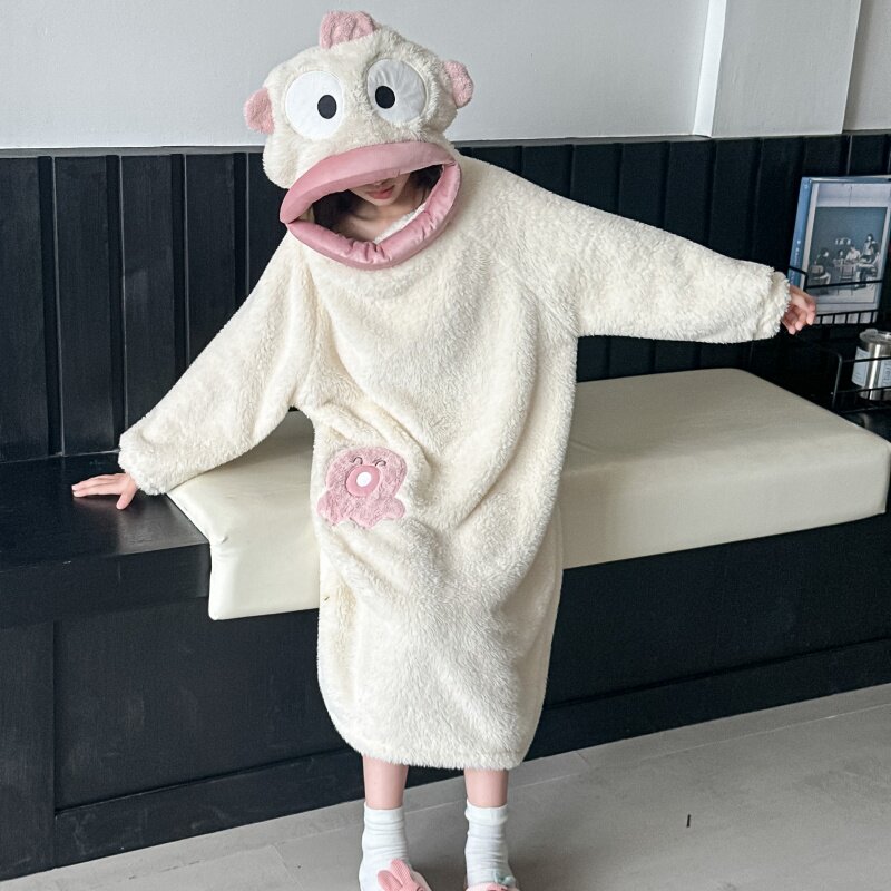 儿童小丑鱼连体睡衣秋冬季珊瑚绒加厚睡袍睡裙家居服亲子白色卡通