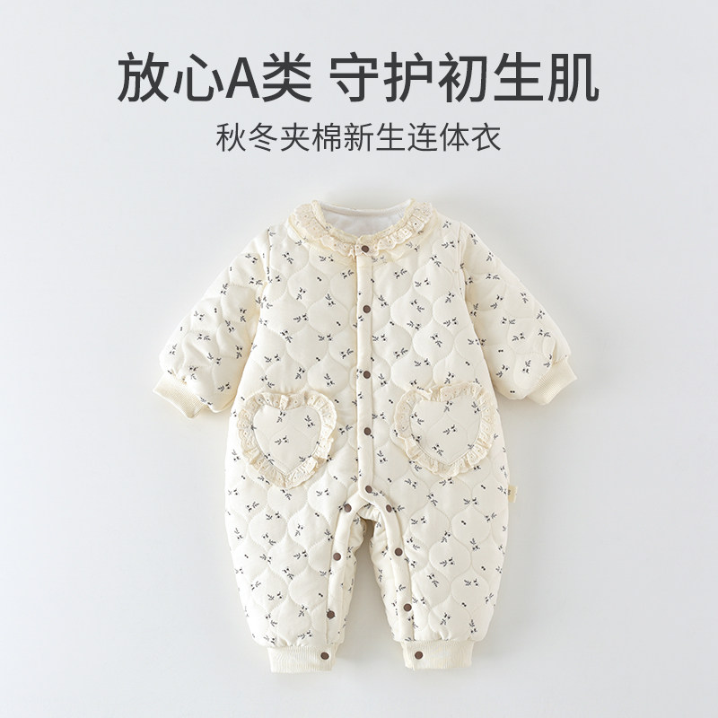 婧麒新生儿婴儿衣服秋冬夹棉满月纯棉初生宝宝秋装连体衣a类爬服