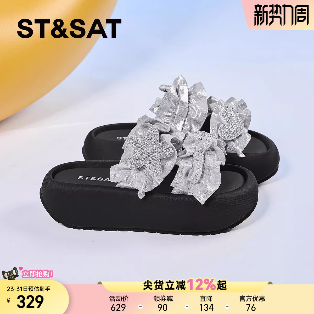星期六厚底一字拖鞋女2026年夏季新款时尚银色一脚蹬星星沙滩拖鞋