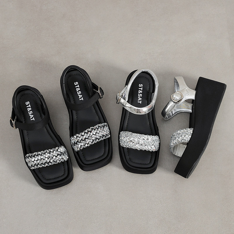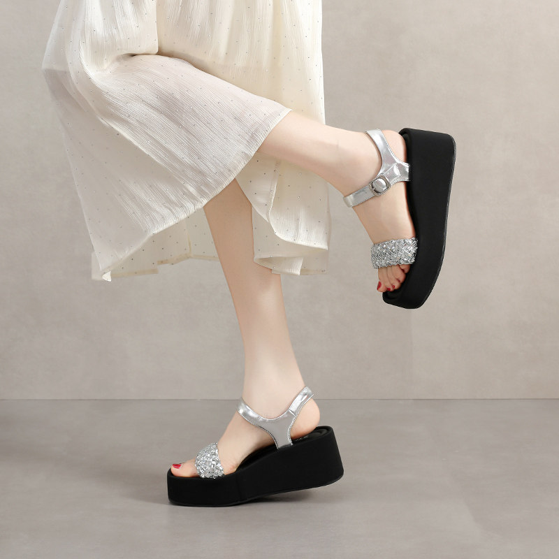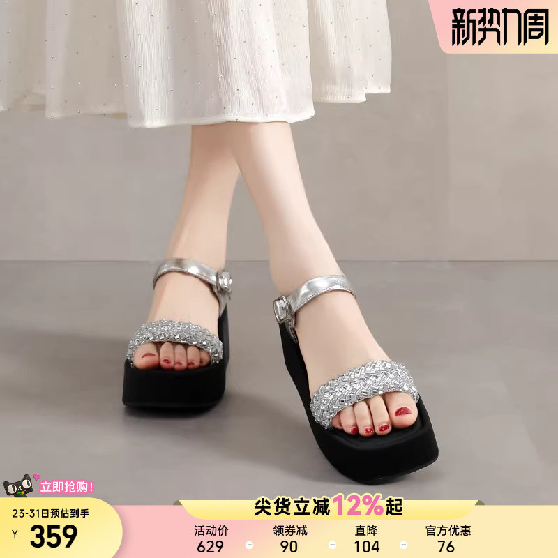 星期六时尚坡跟凉鞋女鞋夏季新款海边凉拖露趾配裙子水钻厚底拖鞋