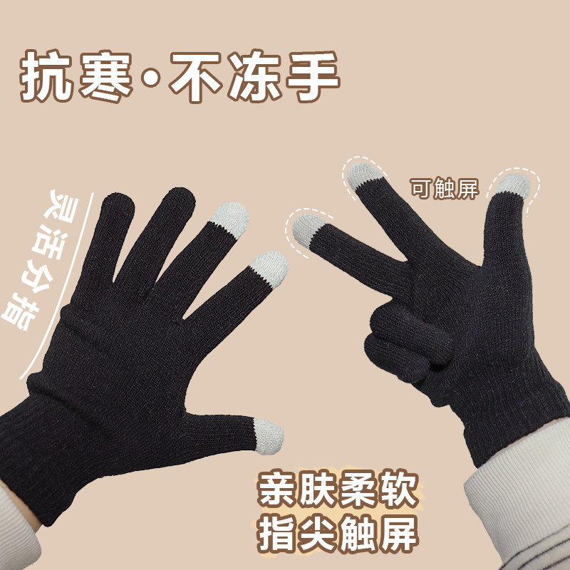 秋冬纯色保暖触屏手套男女通用学生骑车针织分指魔术黑色毛线手套