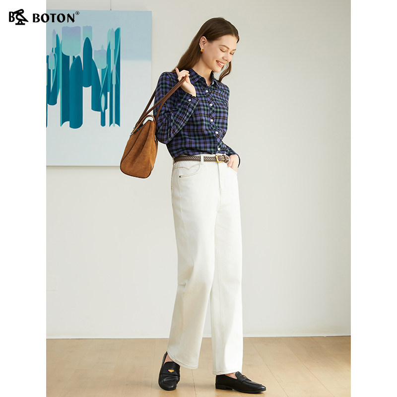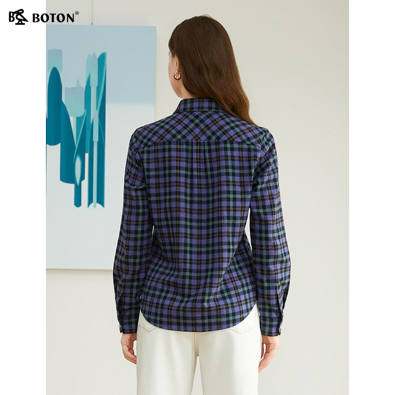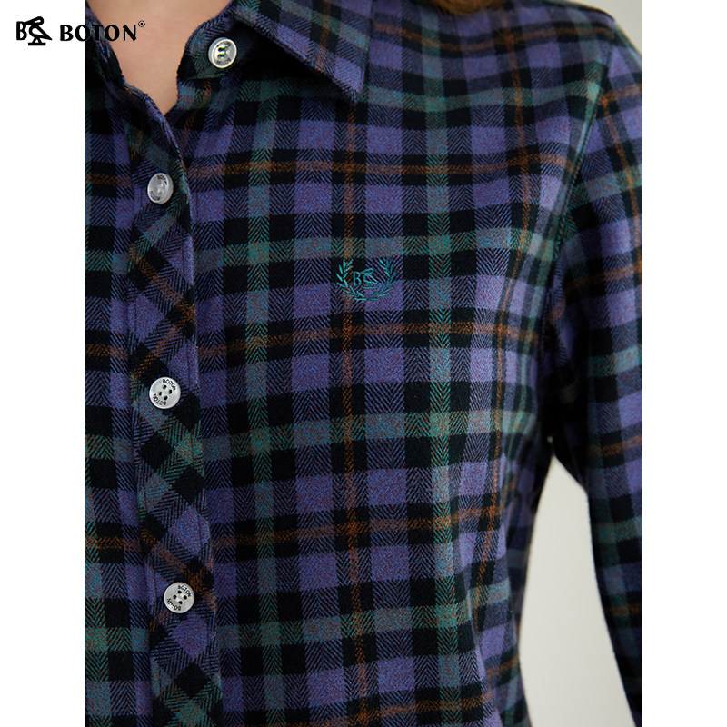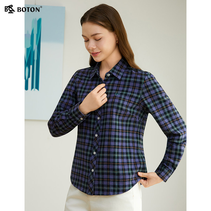波顿秋冬新款翻领长袖磨毛格子全棉衬衫修身衬衣休闲通勤百搭舒适
