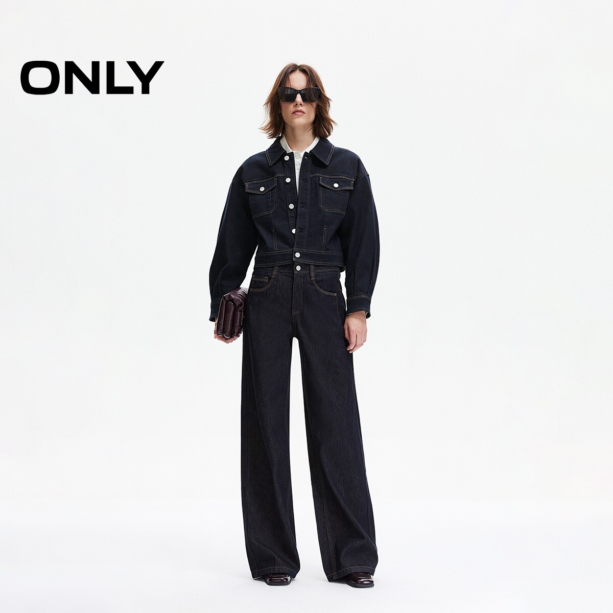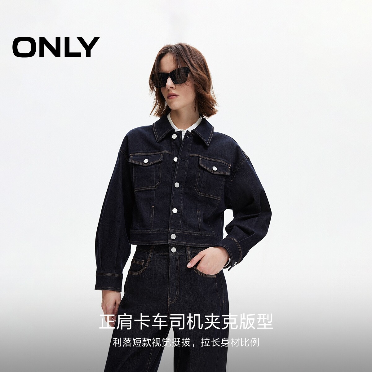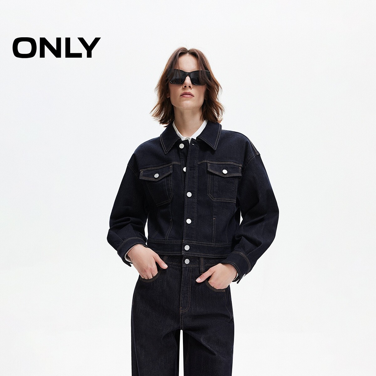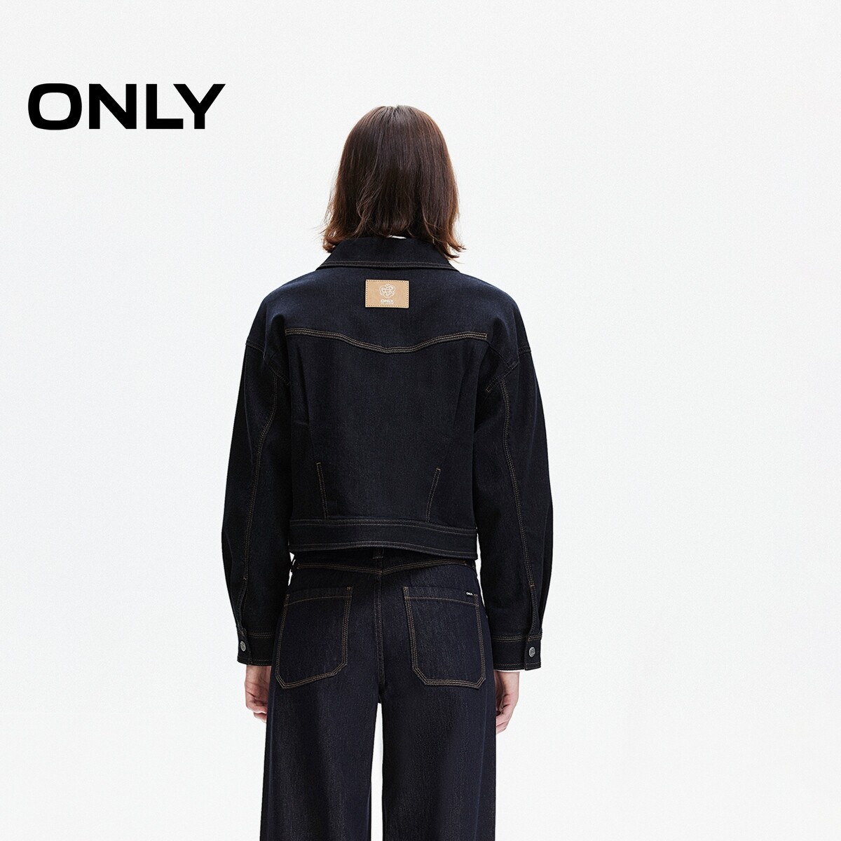 ONLY春季翻领撞色明线装饰翻盖贴袋短款牛仔工装外套女