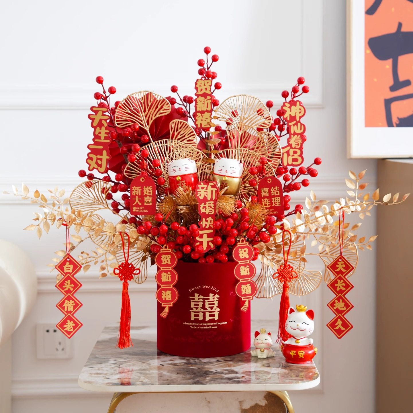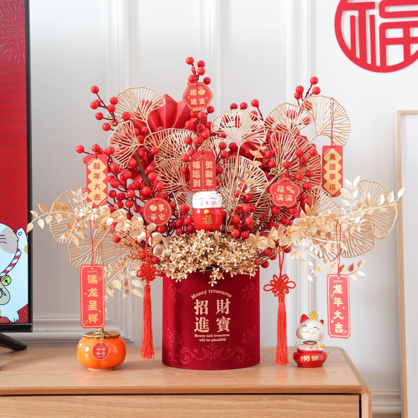 过年乔迁仿真花假花摆设新年抱抱福桶年宵花发财果客厅装饰花摆件