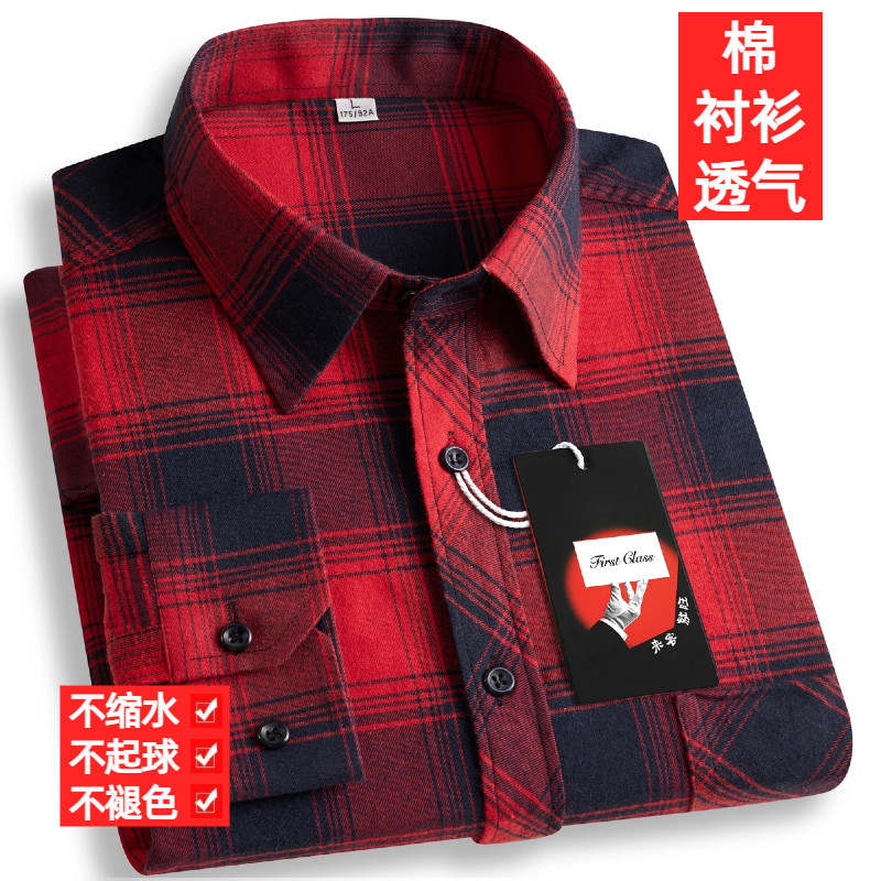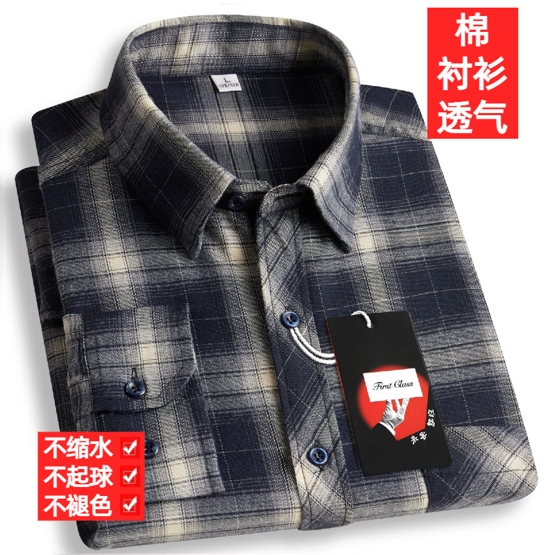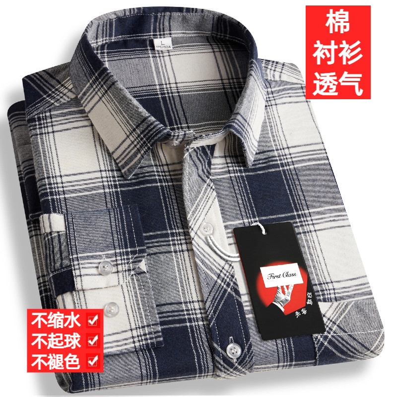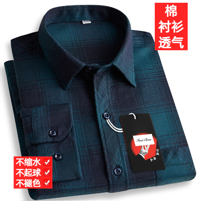 纯棉100%中老年男士格子长袖衬衫免烫抗皱休闲衬衣商务爸爸装