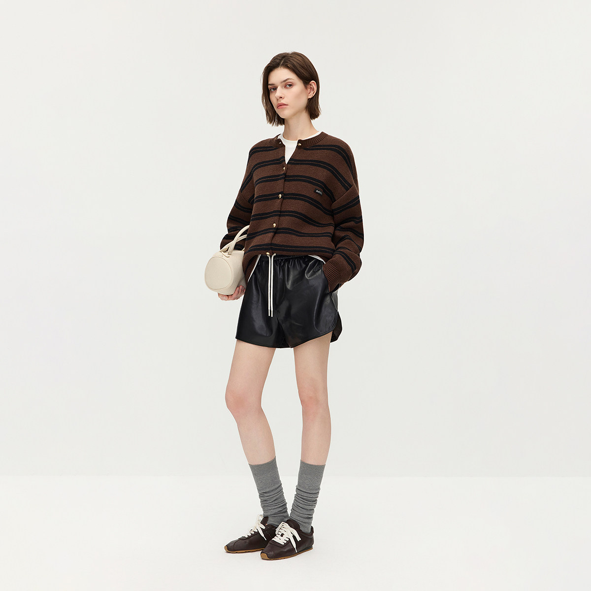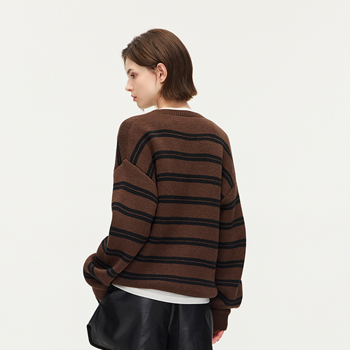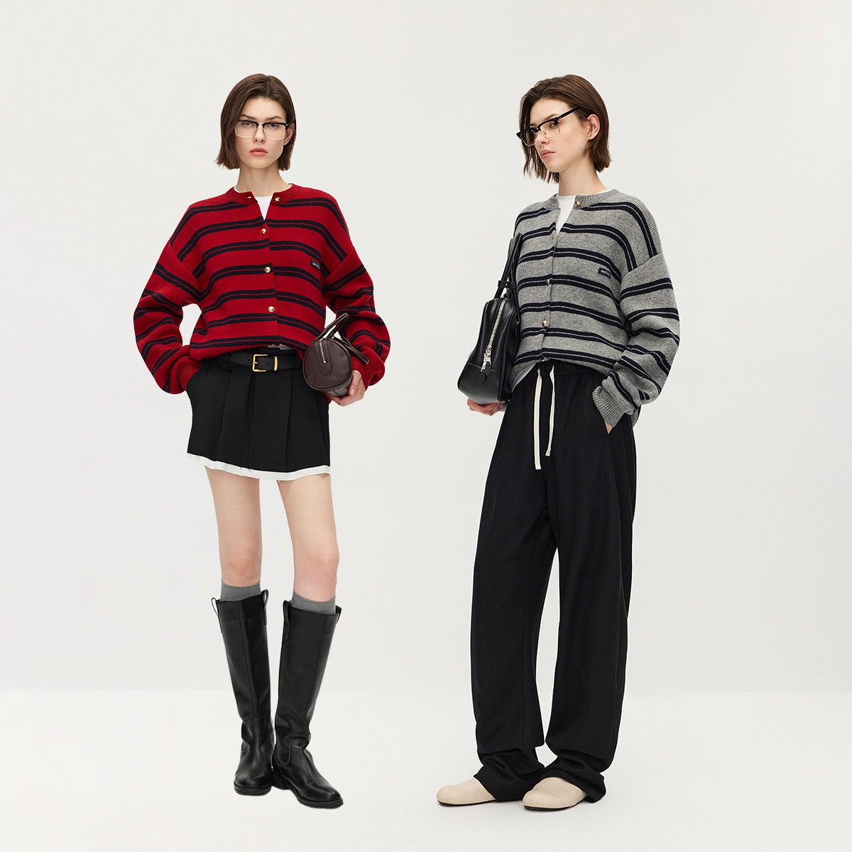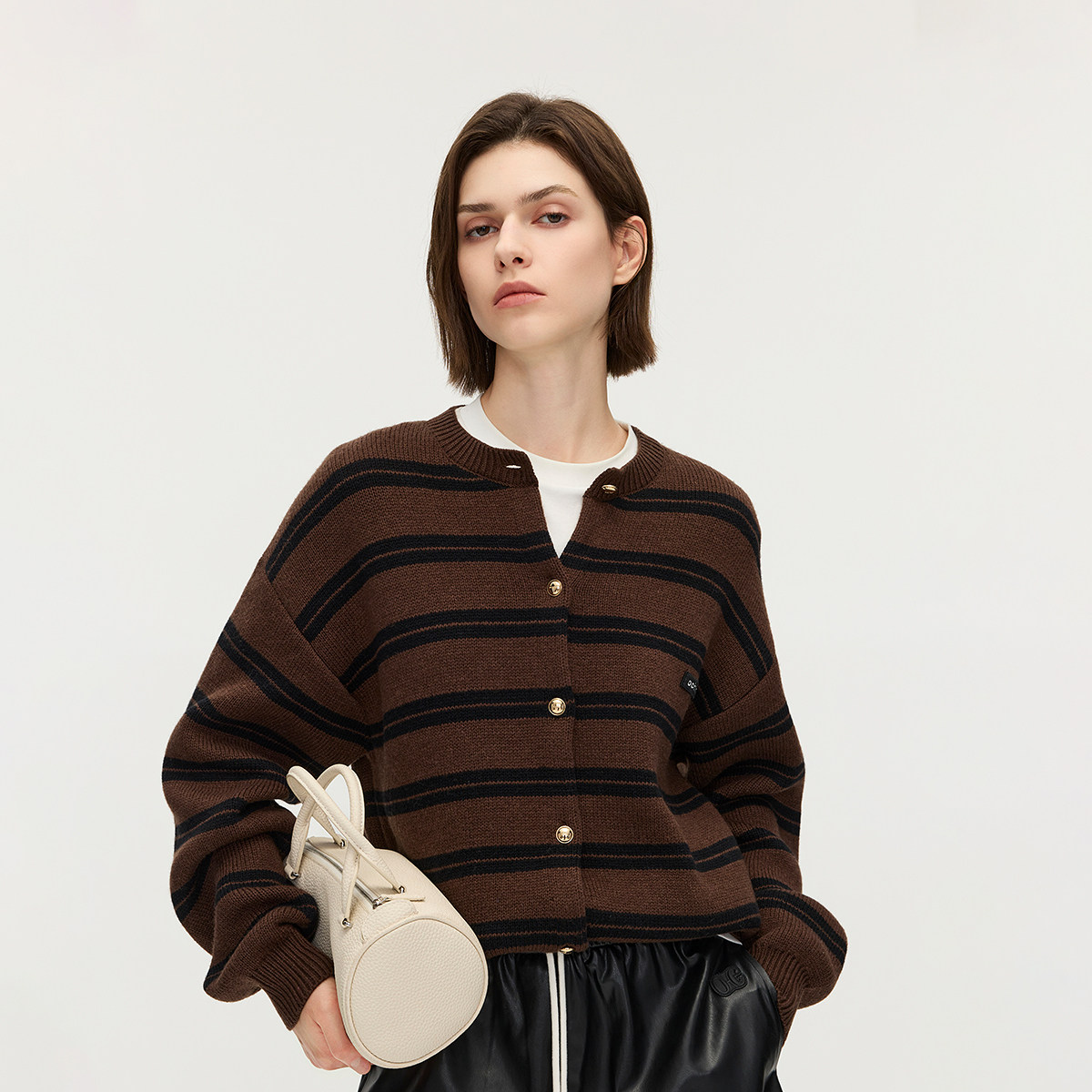 OCHIRLY欧时力 羊毛条纹针织外套休闲上衣圆领开衫2025秋新