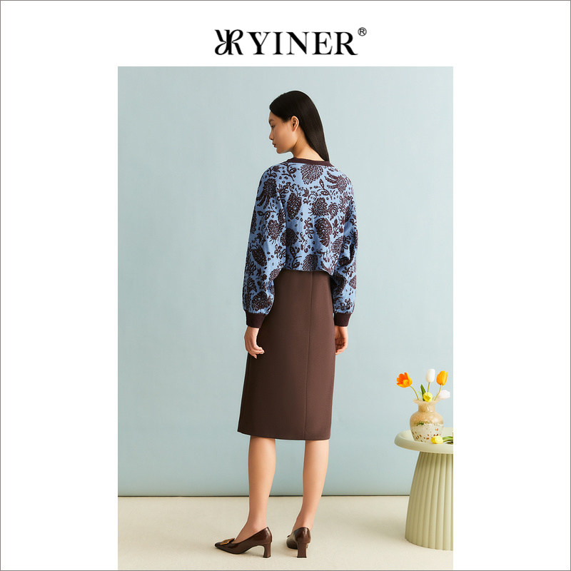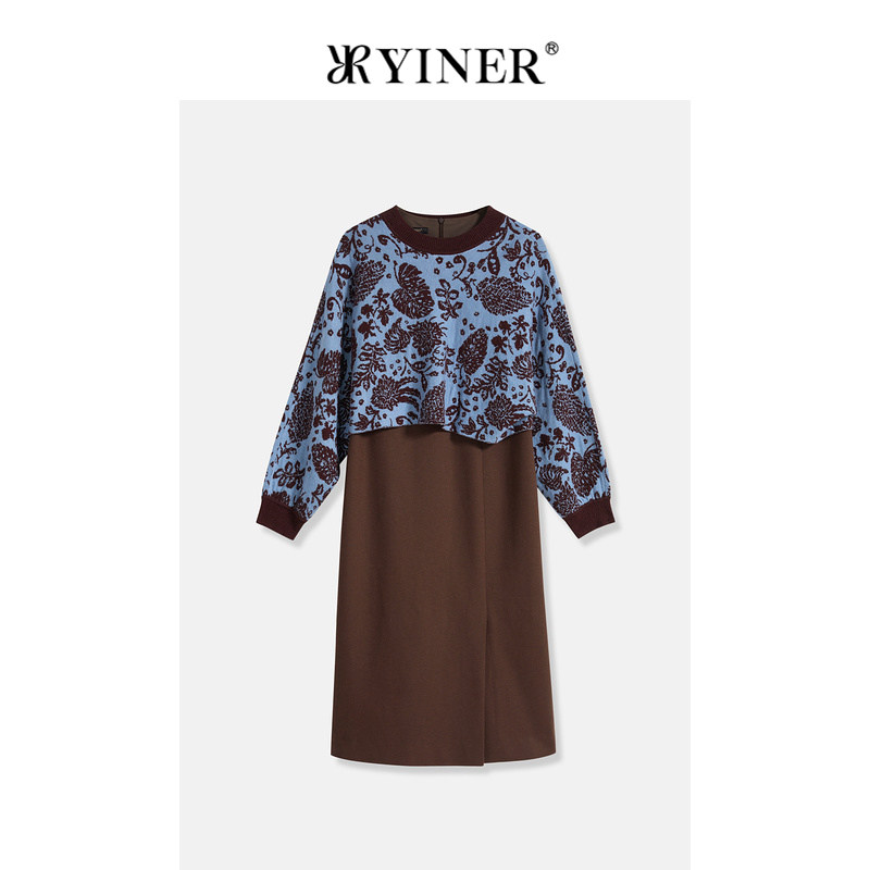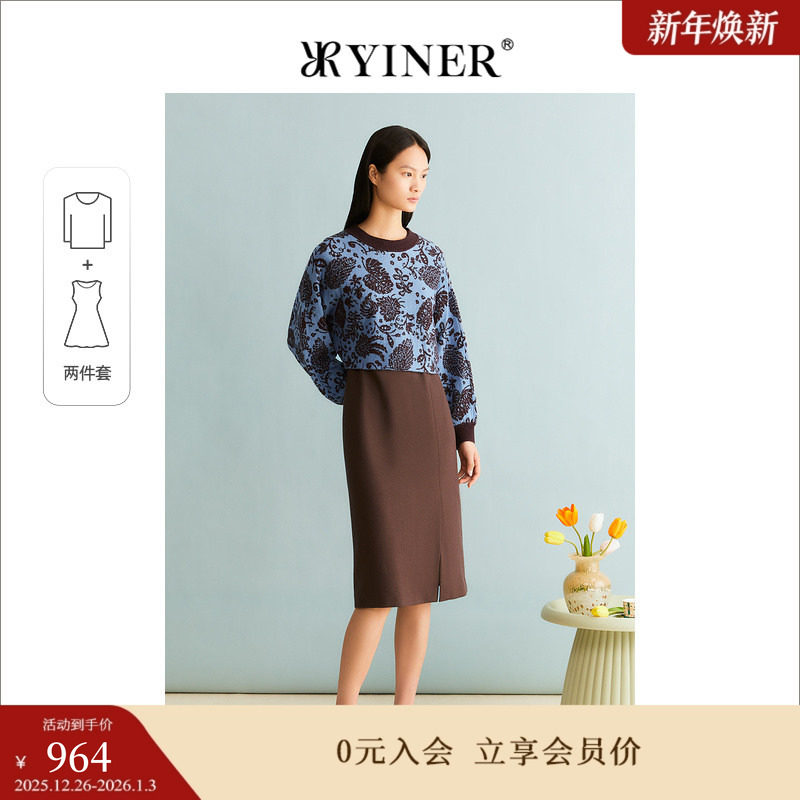 YINER音儿女装冬季纯羊毛印花连衣裙针织衫女装套装