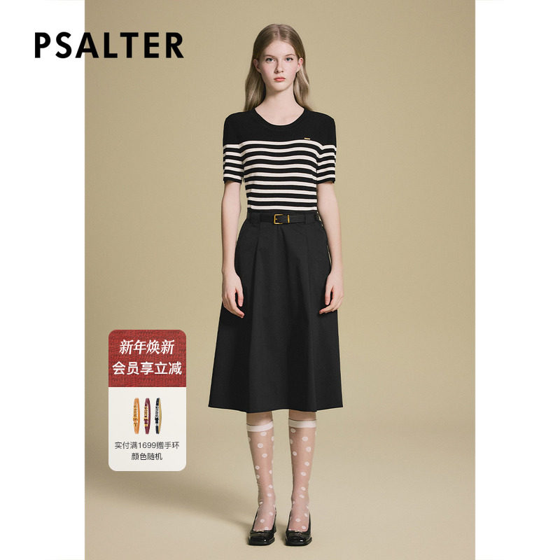 诗篇专选假两件条纹针织拼接连衣裙显瘦小黑裙配腰带2025夏季新款
