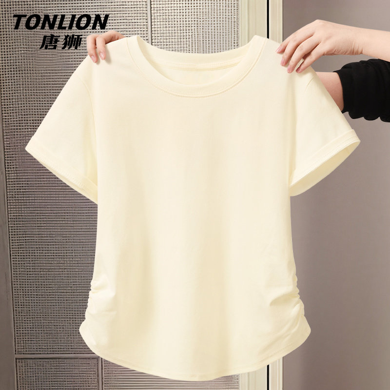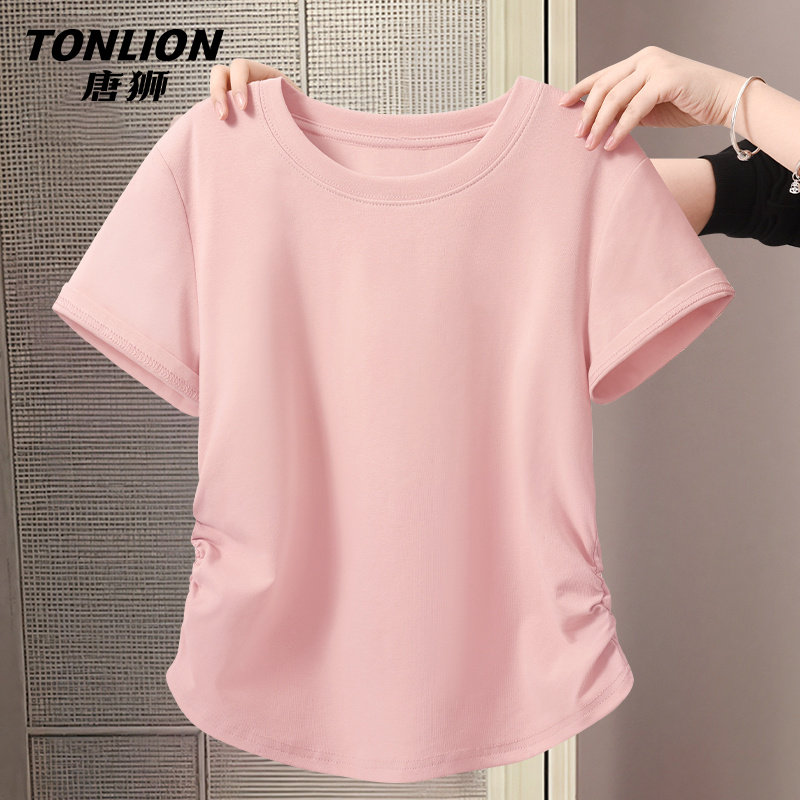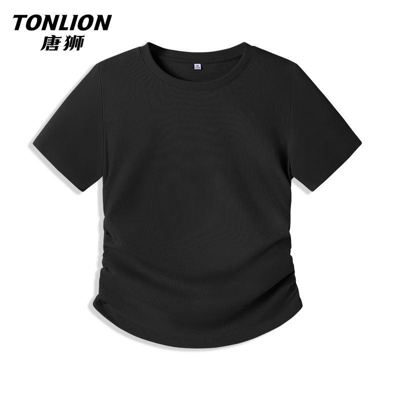 唐狮黑色短袖t恤女2026夏新款时尚百搭休闲抽褶紧身正肩上衣VB