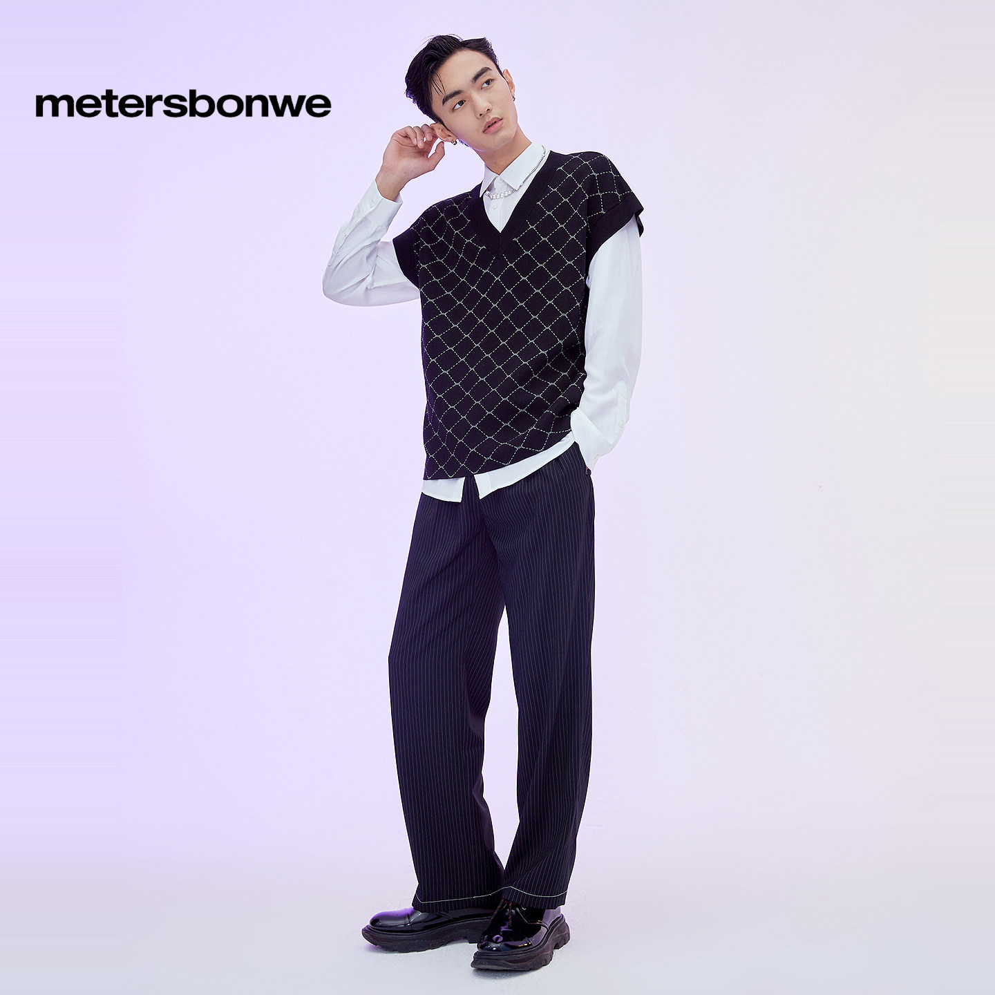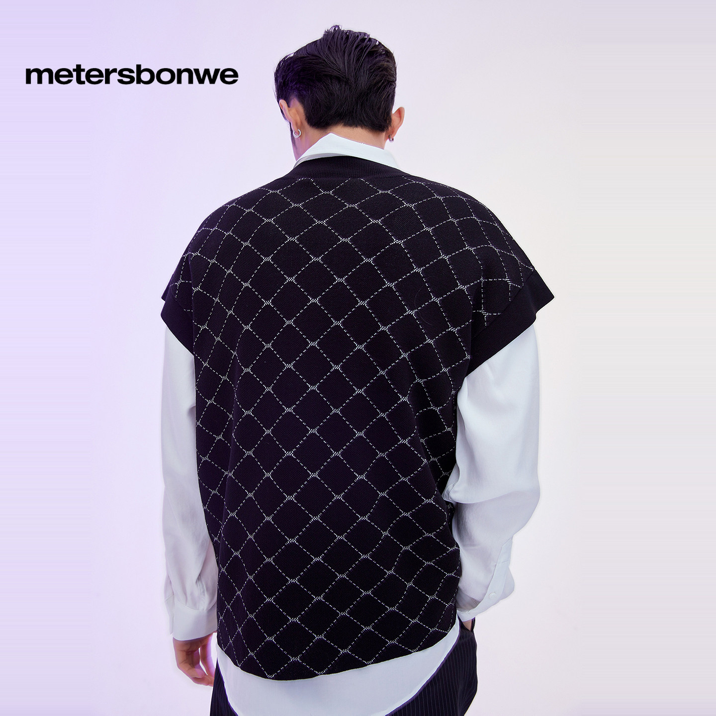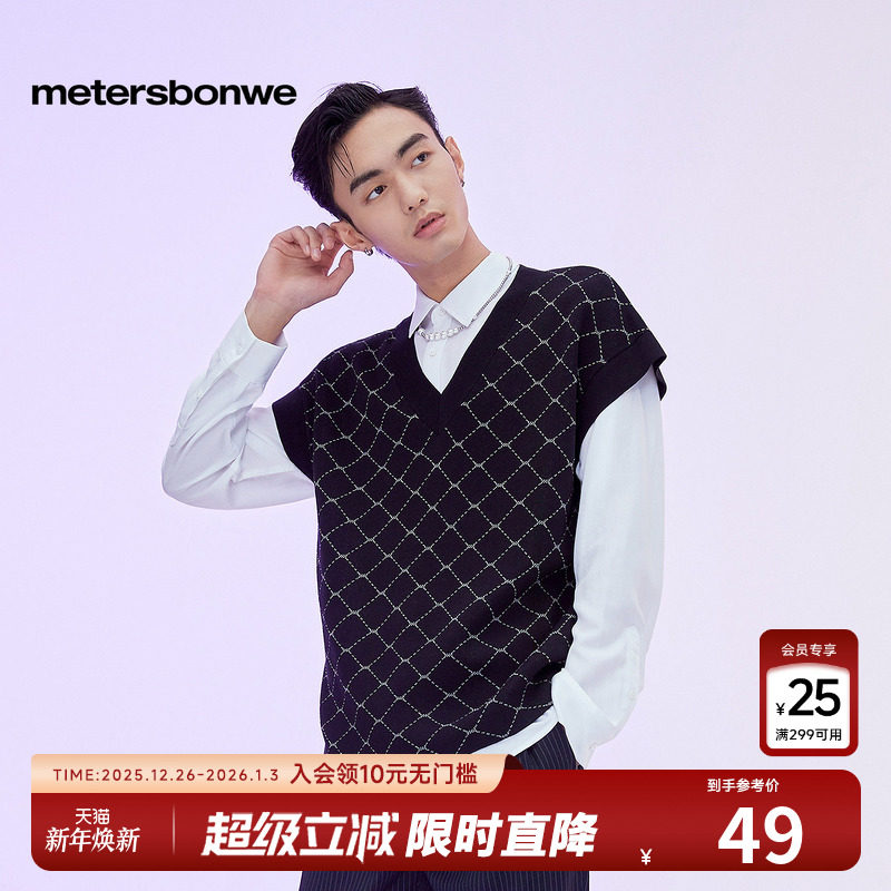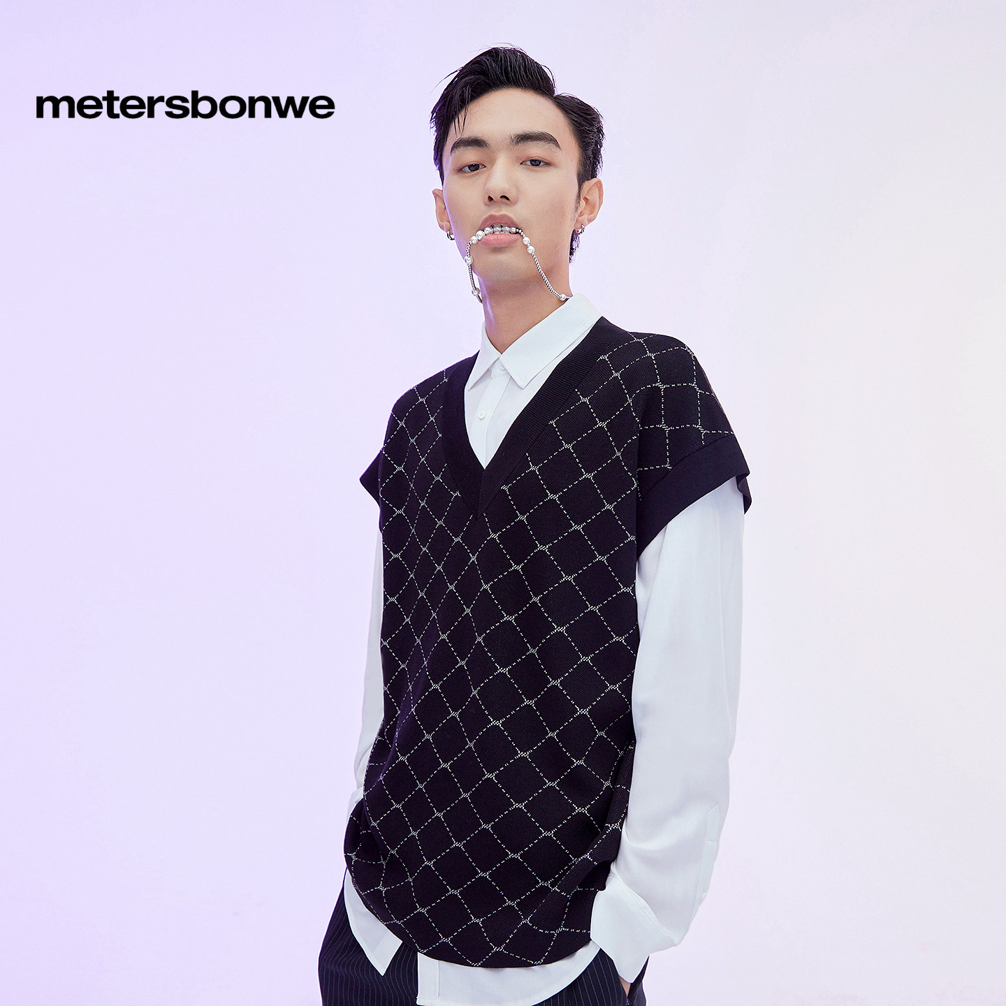 美特斯邦威毛织短袖背心男士V领春秋季时尚潮流满印宽松毛衫上衣