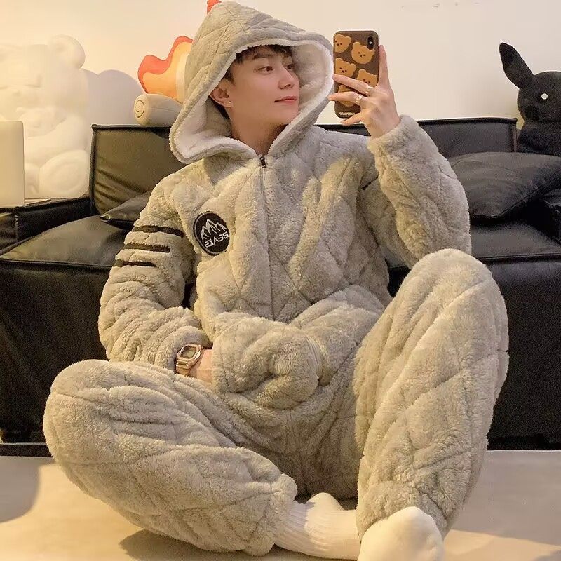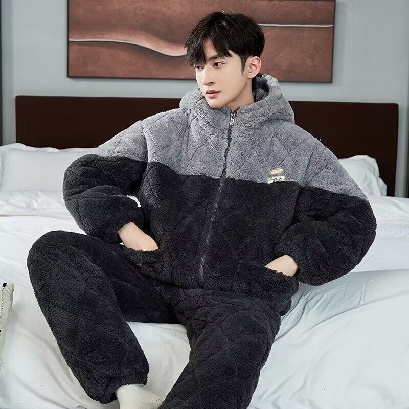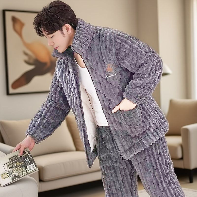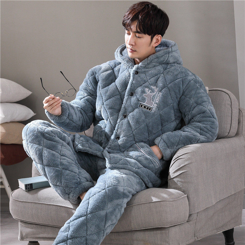 冬季男士夹棉睡衣上衣三层加厚加绒珊瑚绒保暖法兰绒单件棉袄套装