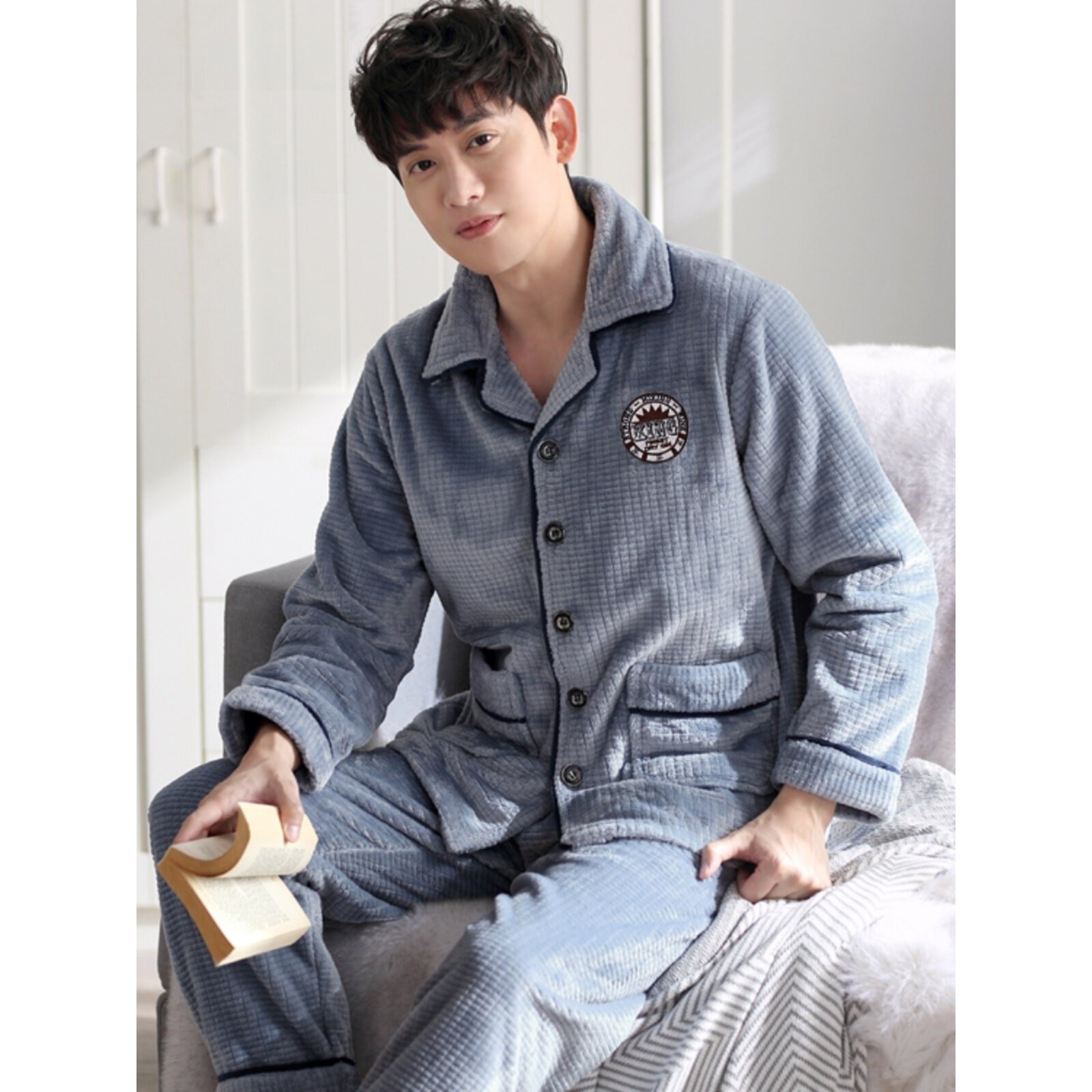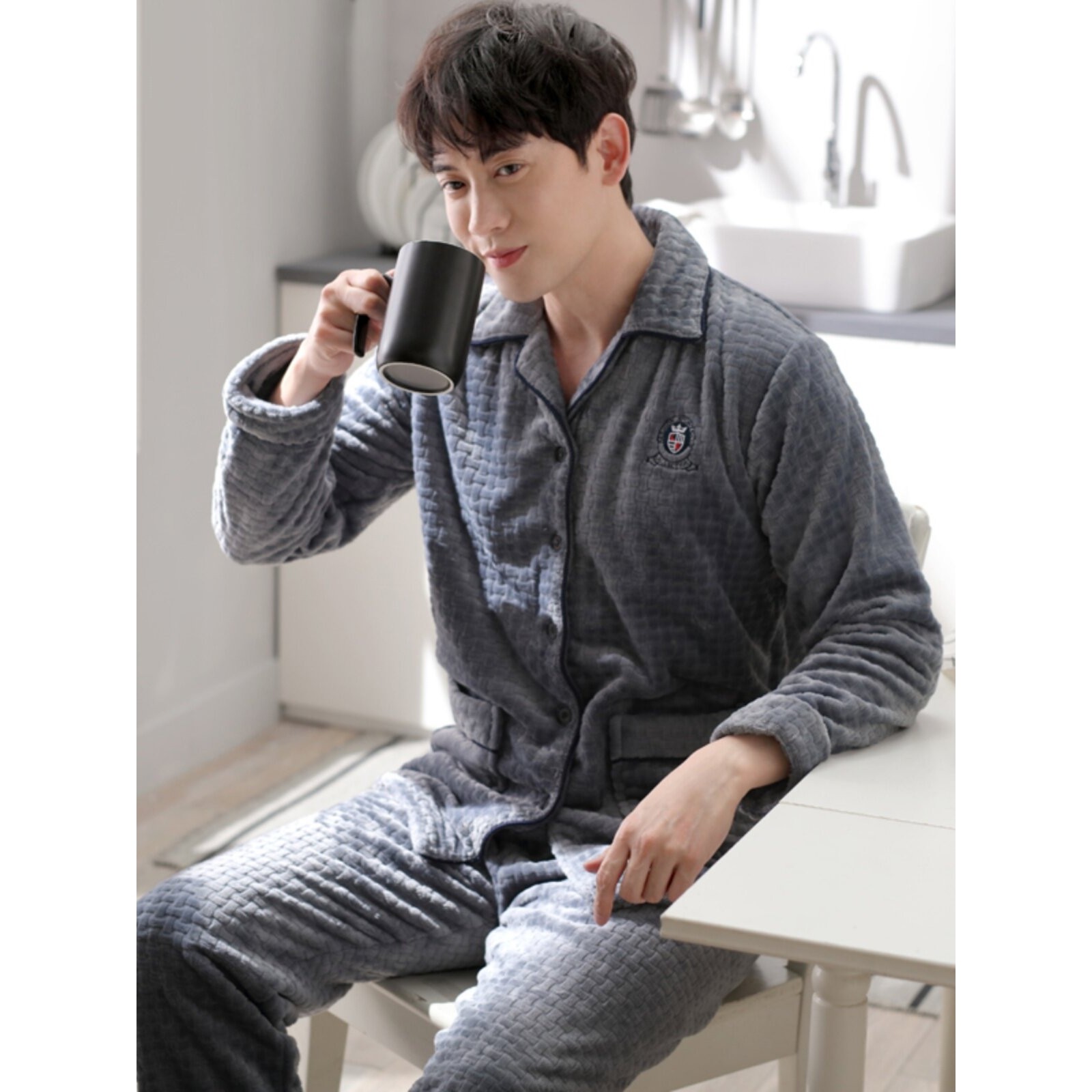 秋冬季珊瑚绒加厚加绒款三层夹棉袄男士睡衣保暖家居服套装可外穿