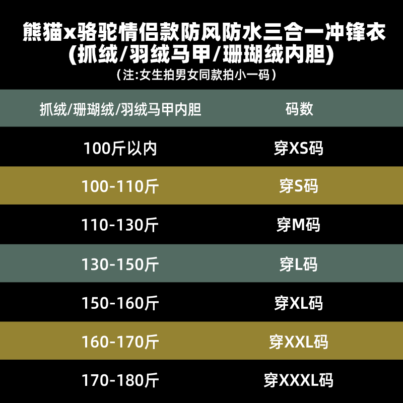 1熊猫骆驼三合一冲锋衣抓绒/鸭绒马甲/珊瑚绒内胆