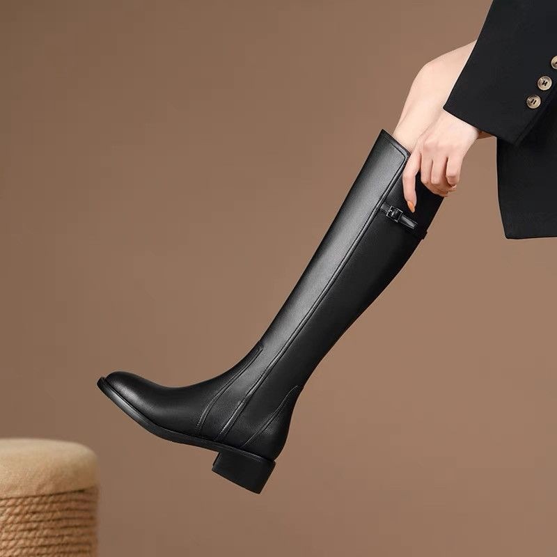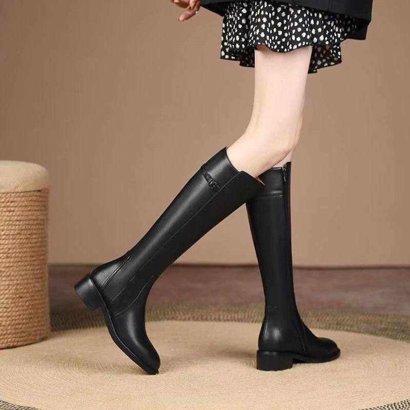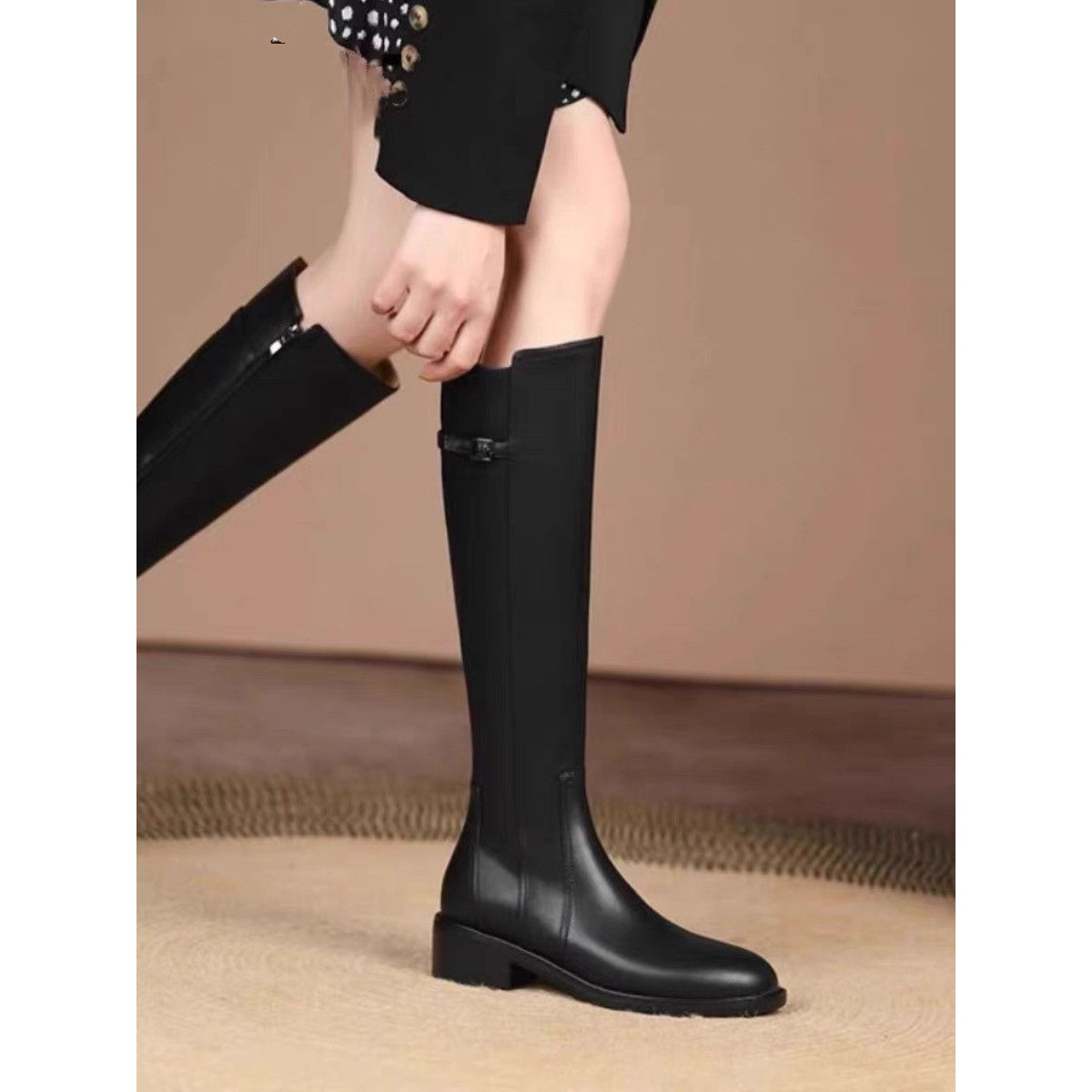 幂琳真皮不过膝高筒靴子女2024秋冬新款中跟皮带扣骑士靴长筒靴