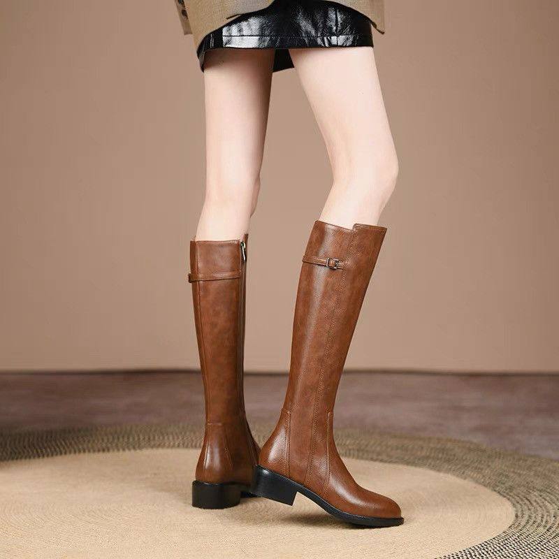 真皮~骄屿皮带扣骑士靴复古英伦风长筒靴棕色显瘦粗跟不过膝长靴