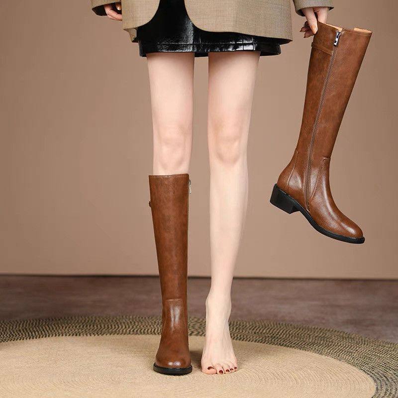 真皮~内增高粗跟骑士靴女秋冬西部靴高筒复古显瘦褶皱堆堆靴长靴