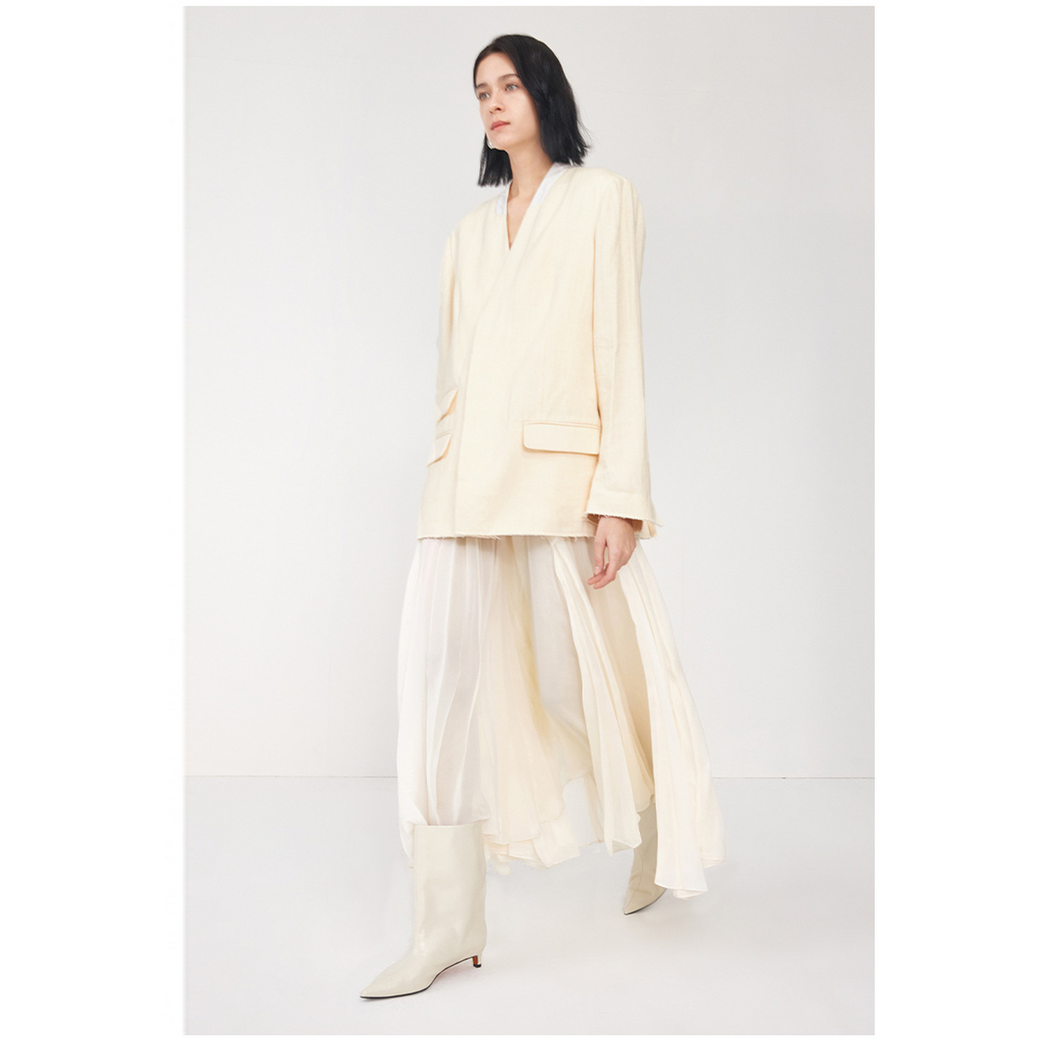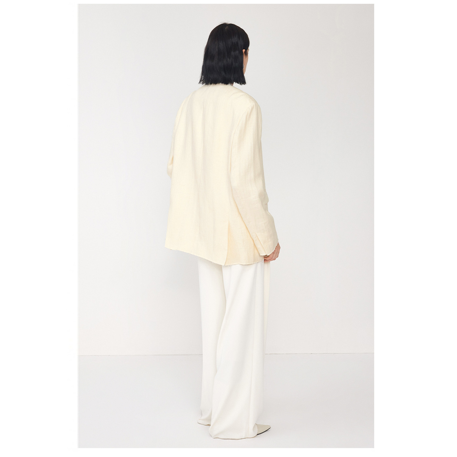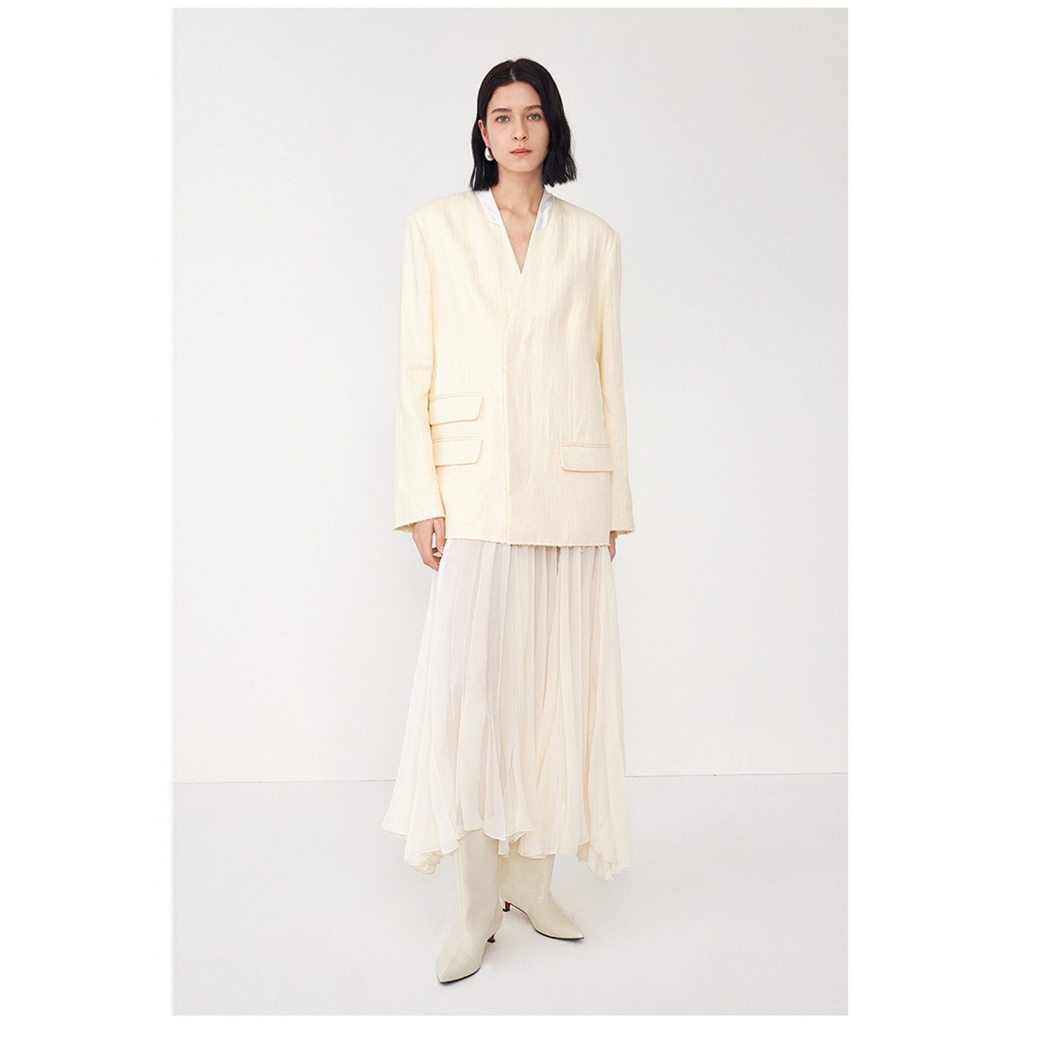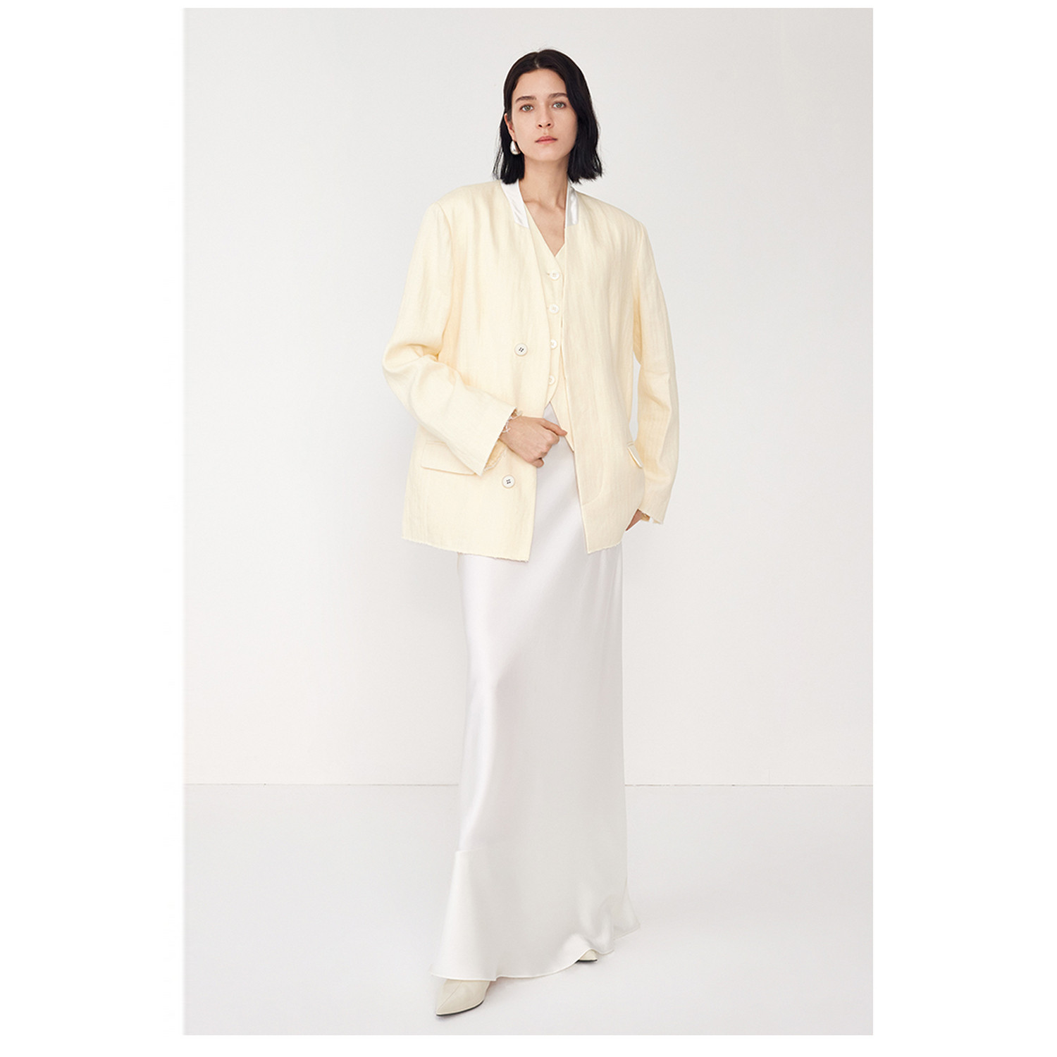 MISSCOCOON可可尼C3系列⼈字纹亚麻棉25年秋冬⽆领廓形西装外套女