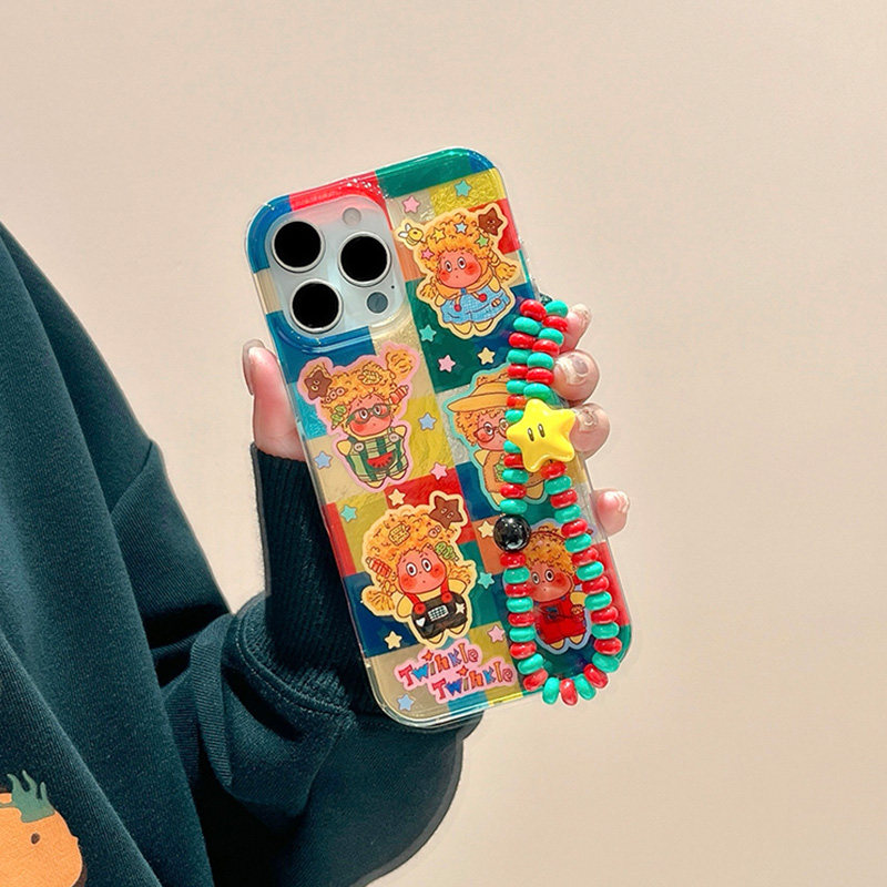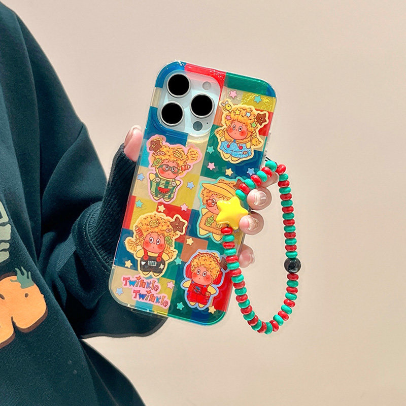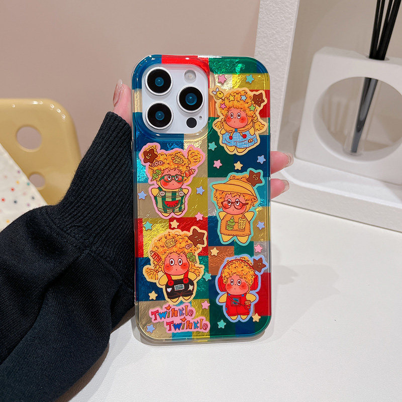 卡通彩色格纹星星小人适用苹果16promax手机壳iPhone15pro新款14创意13镭射12女11可爱xr好看x全包防摔保护套