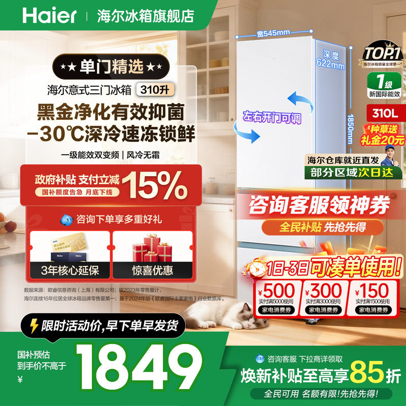 【国补告急】海尔冰箱310升三开门一级变频节能小型家用官方正品