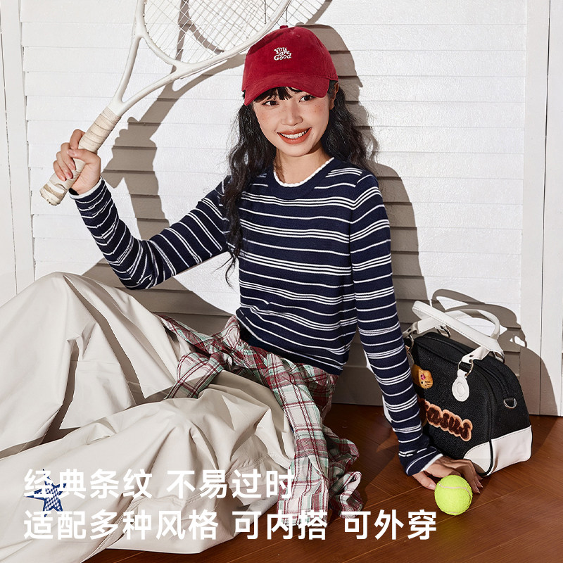 三福长袖上衣2025新款秋季圆领修身针织衫简约纯色内搭打底衫女装