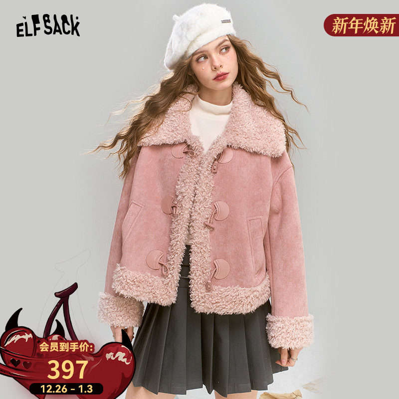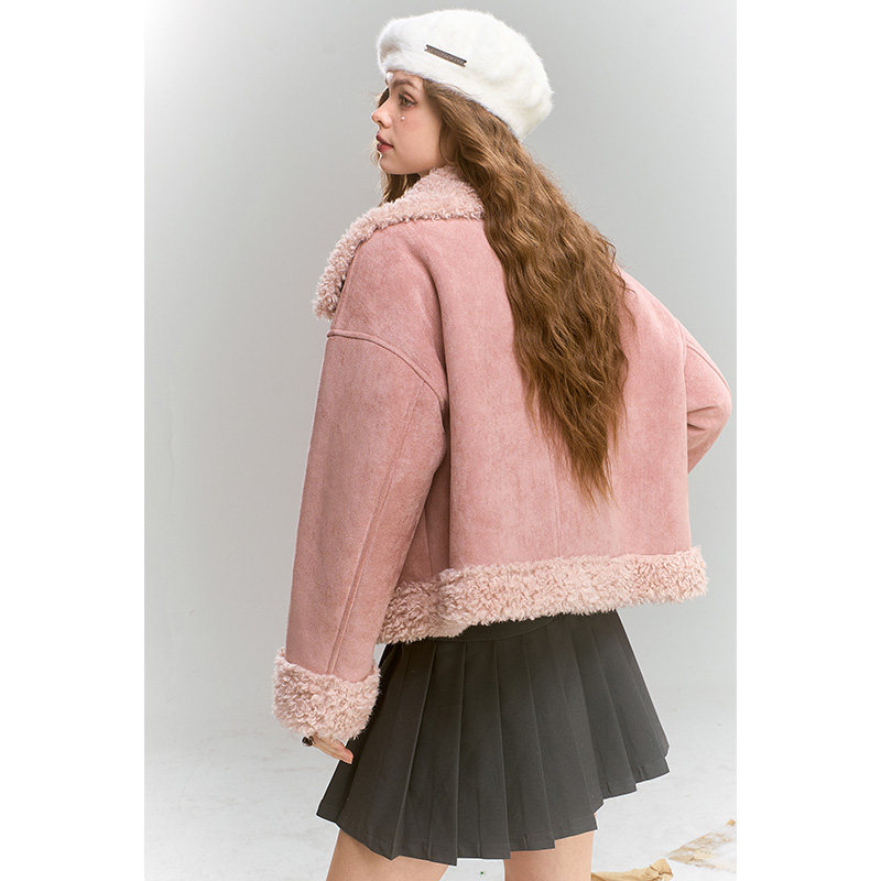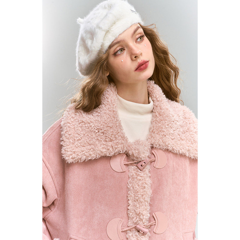 妖精的口袋粉色毛绒绒毛呢外套女2025年冬季新款千金风甜美厚外套
