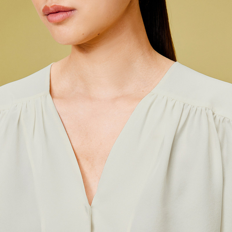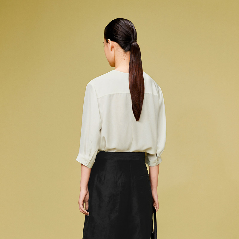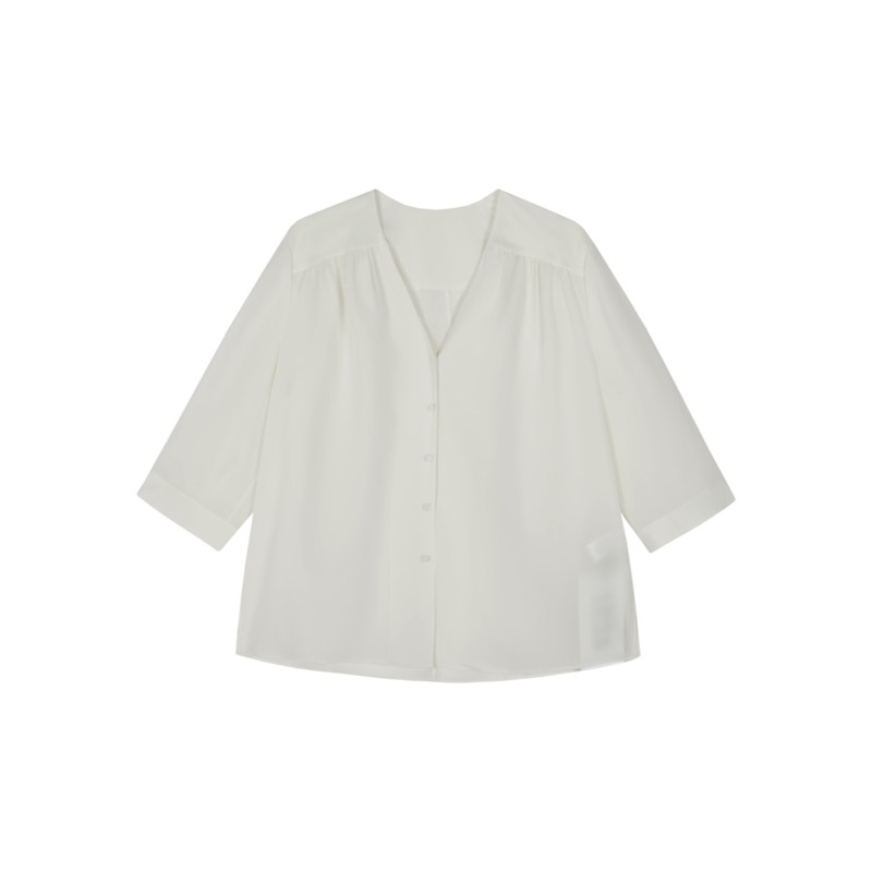 LESS通勤感桑蚕真丝褶皱宽松衬衫女休闲简约V领中袖衬衣2O5213590