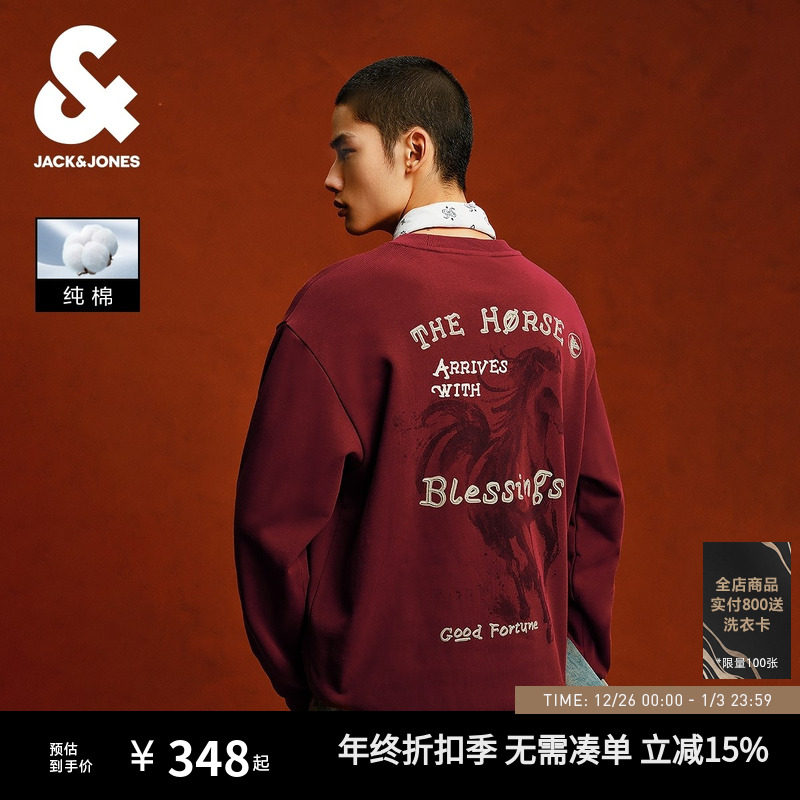 【马年新年款】杰克琼斯男装红色纯棉水洗卫衣男印花宽松本命年