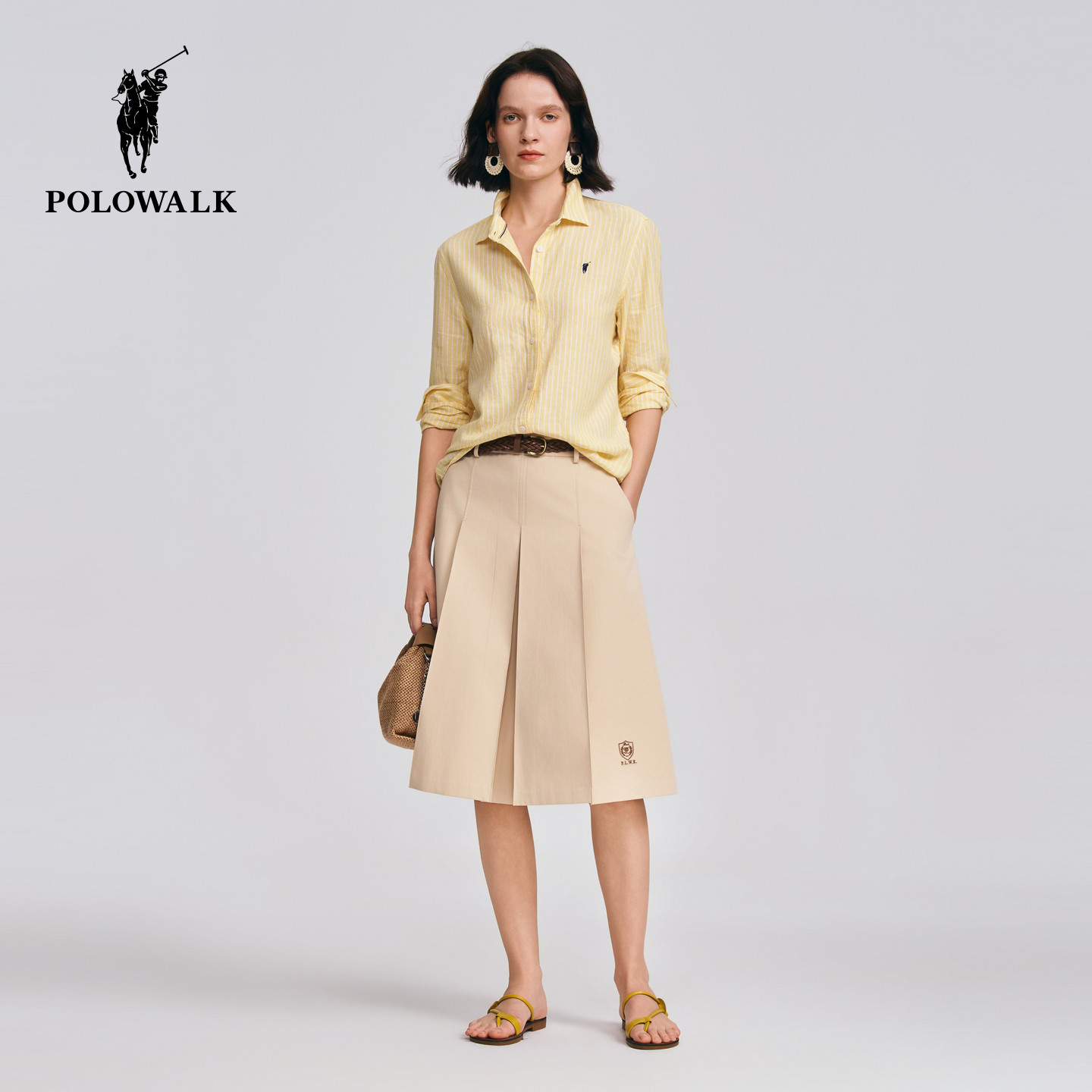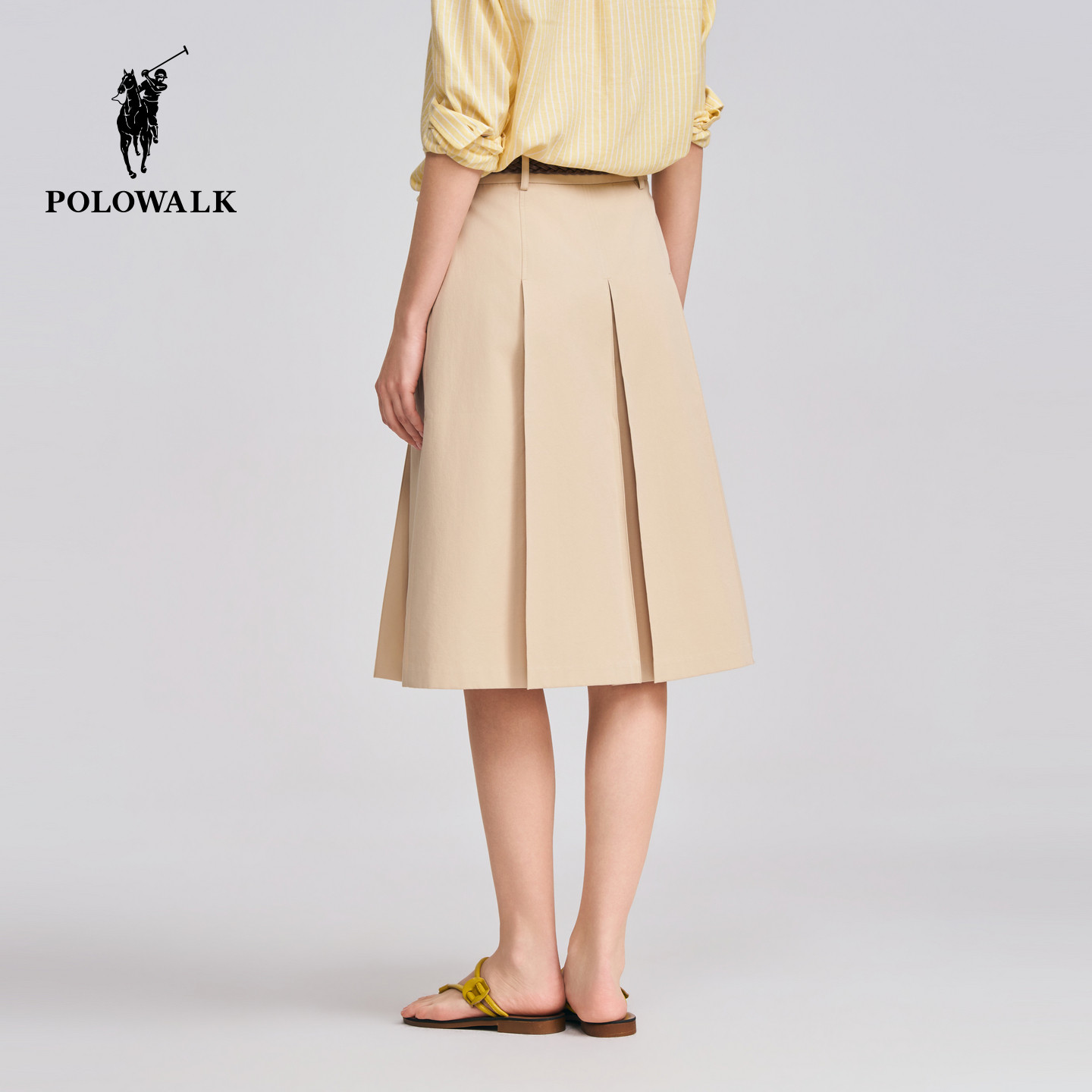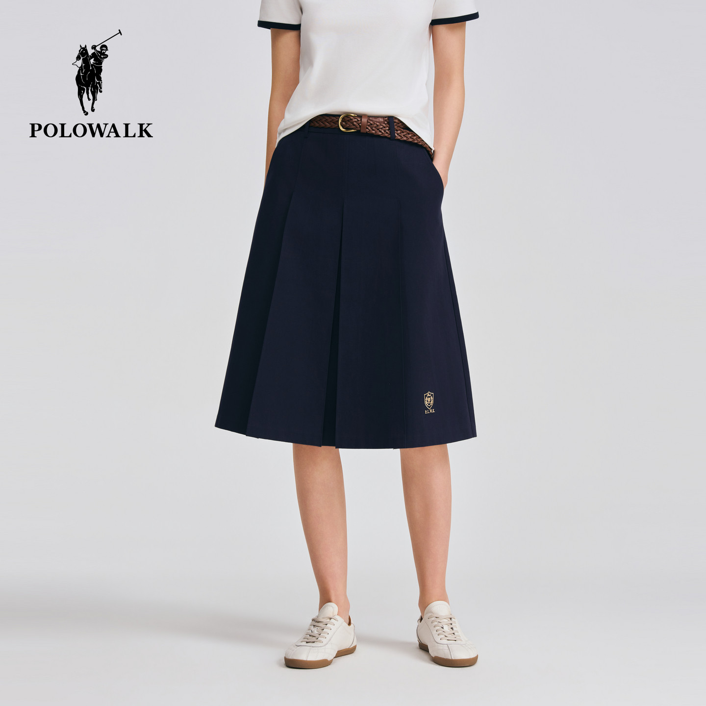POLOWALK女士半裙2026春夏裤新款学院风编织腰带A字版纯棉半身裙