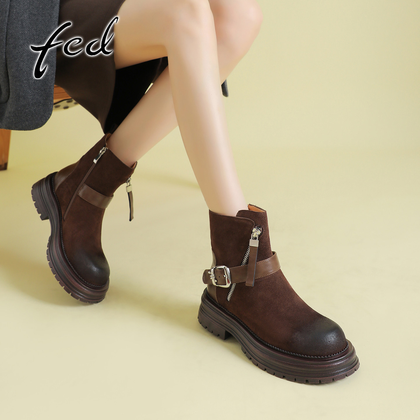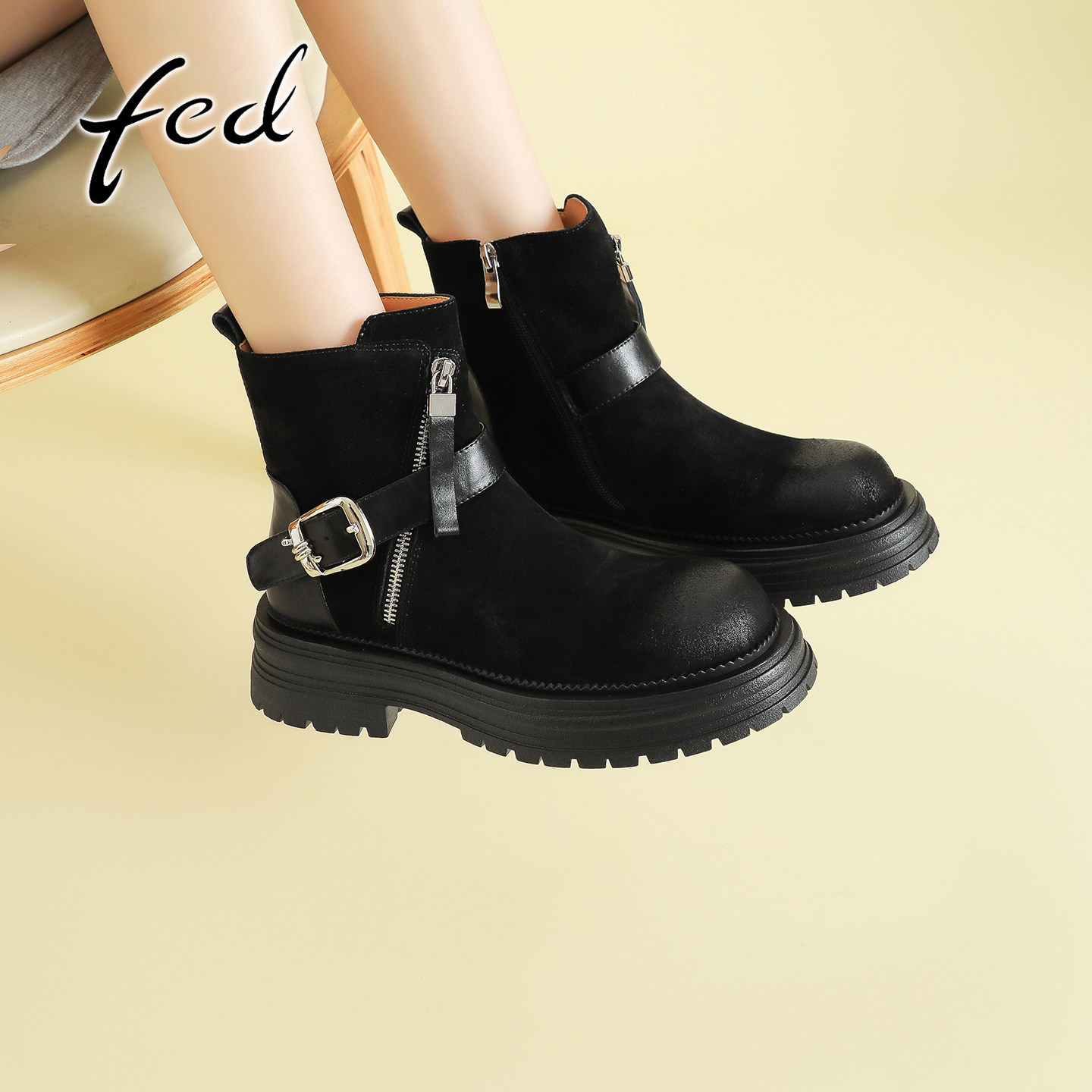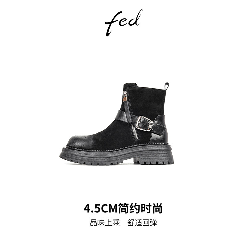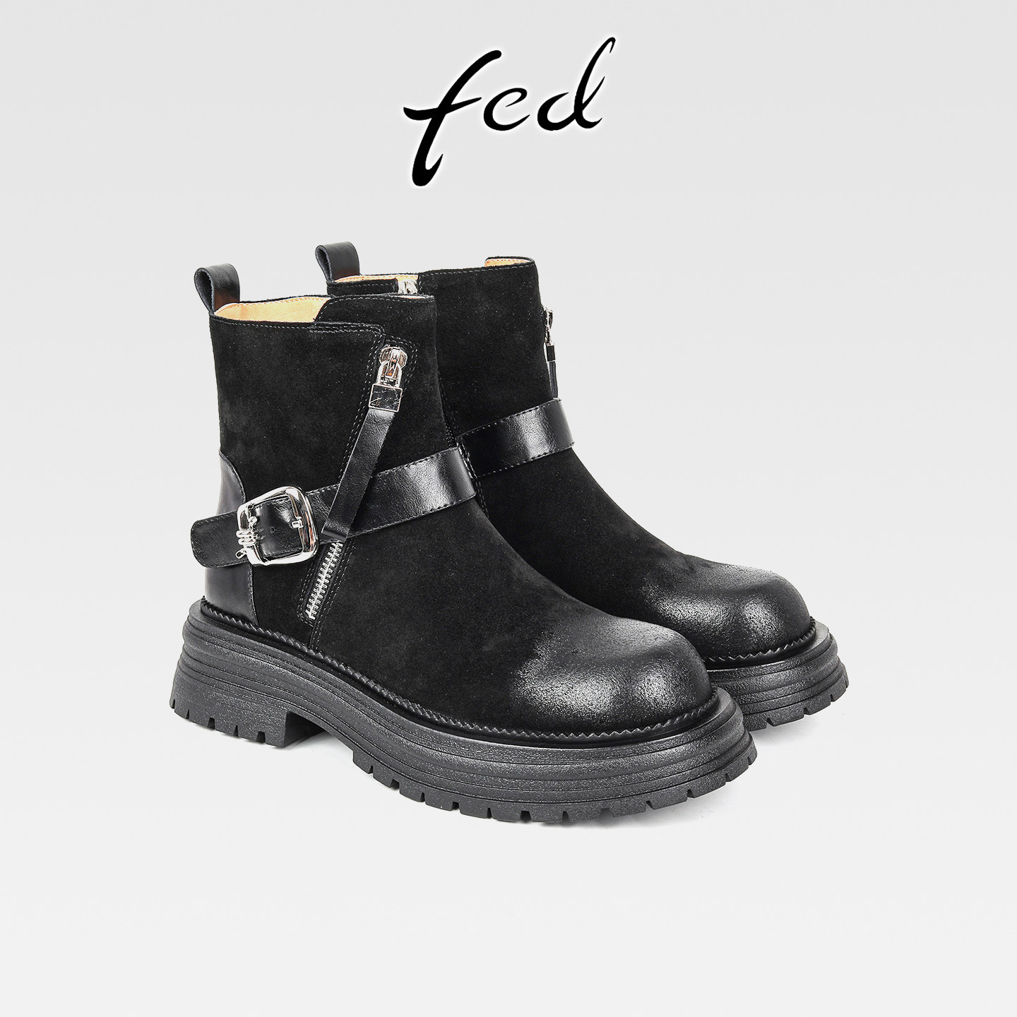 fed复古擦色牛反绒厚底皮带扣马丁靴女秋冬款侧拉链中跟圆头短靴