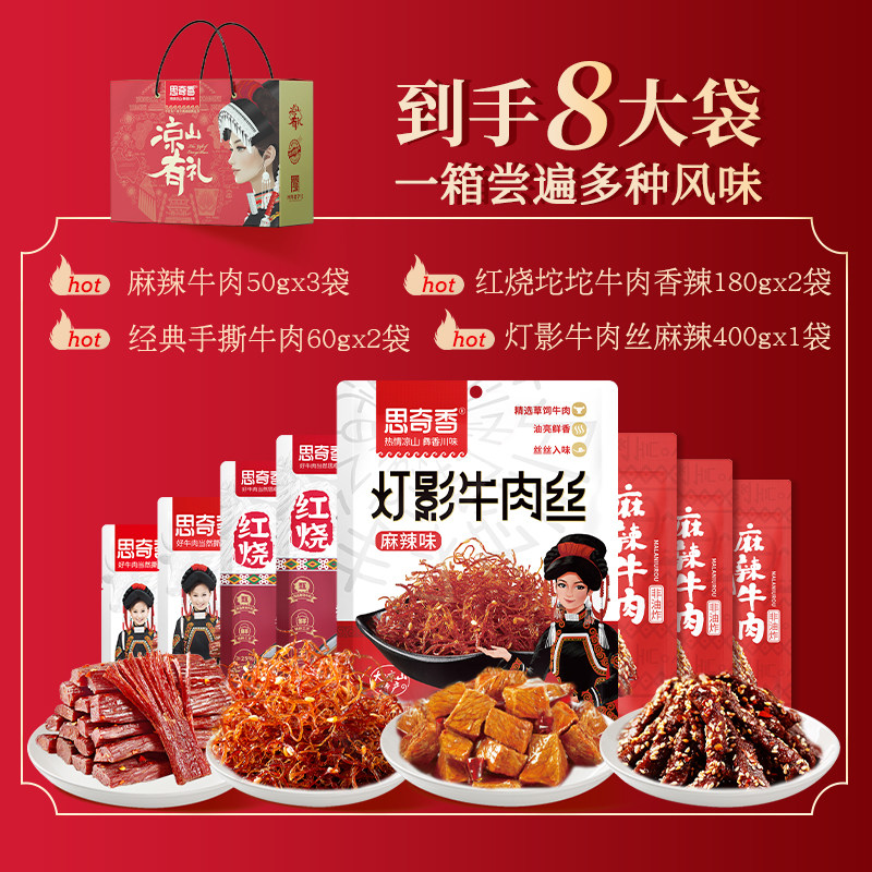 思奇香手撕牛肉干风干大凉山特产零食大礼包五香麻辣味礼盒装