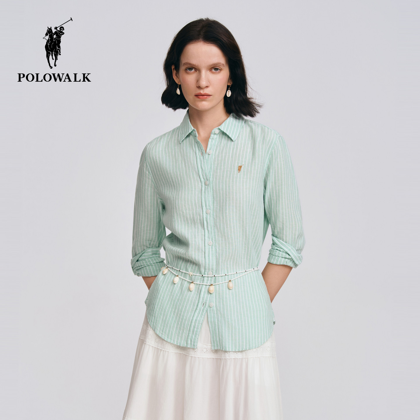 POLOWALK女式衬衫2026春季新品亚麻混纺条纹翻领休闲通勤长袖衬衫