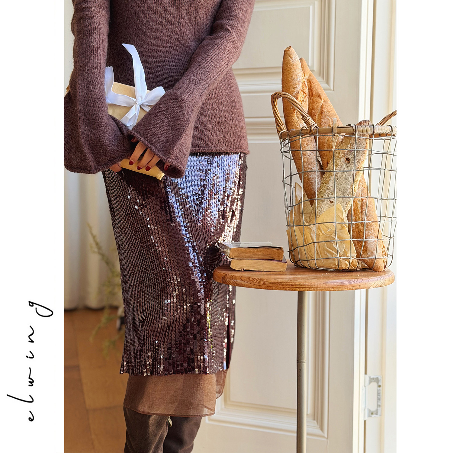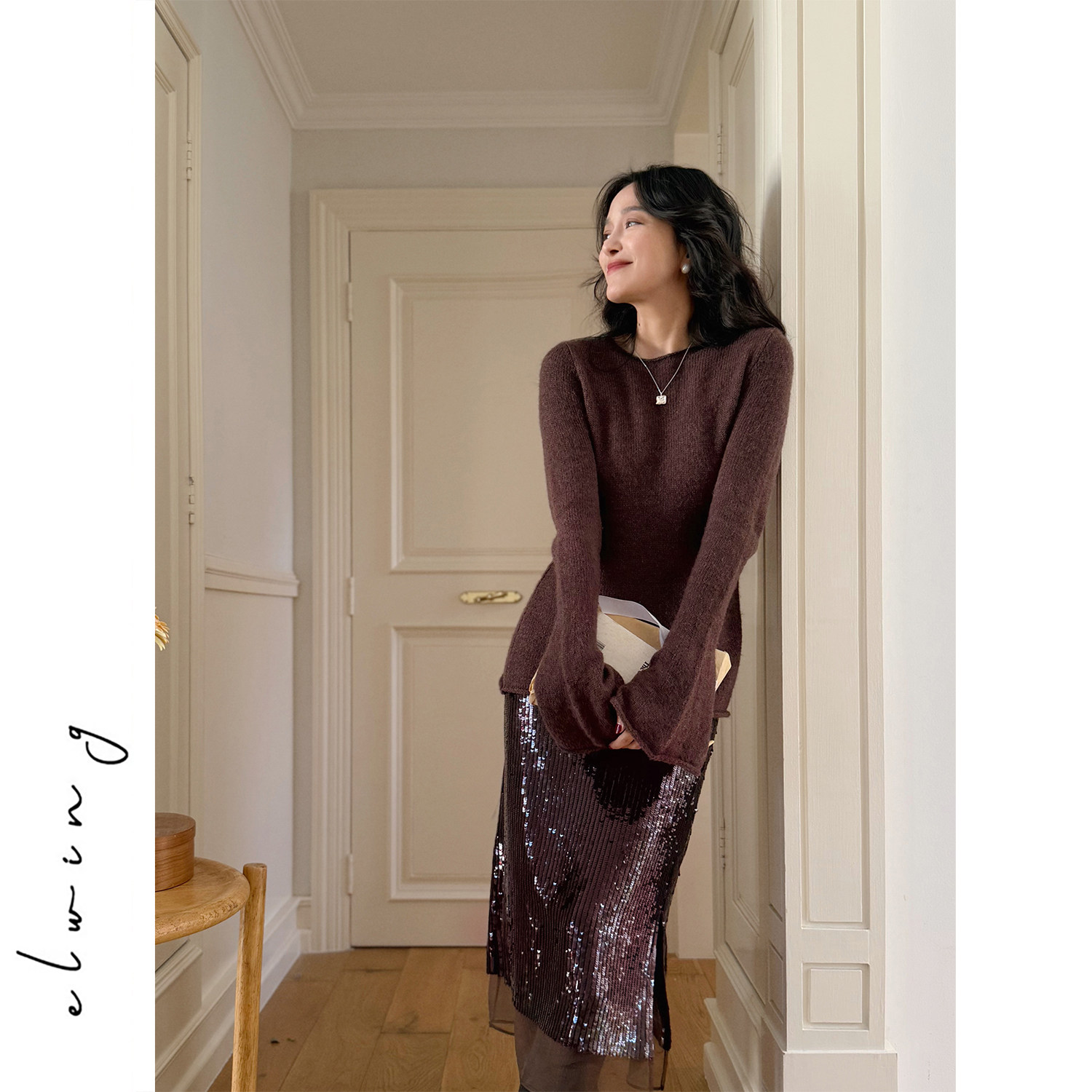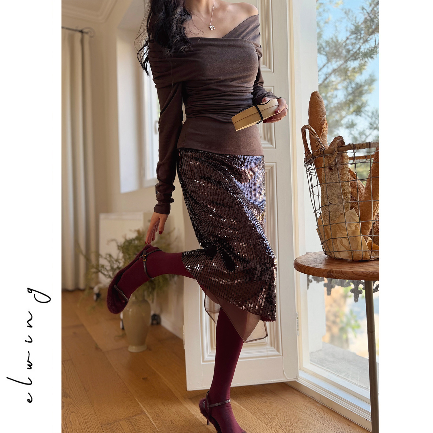 Elwing原创灵动流光酒红高密亮片欧根纱开叉显瘦半身裙