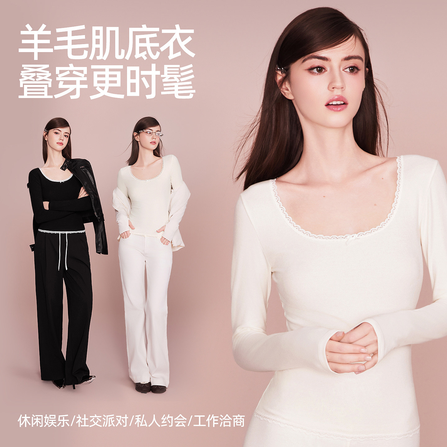 好奇蜜斯羊毛保暖内衣女发热抗静电肌底衣秋冬内搭打底衫加绒秋衣