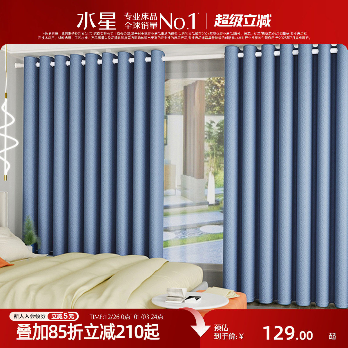 水星家纺窗帘免打孔安装卧室门帘全遮光飘窗窗帘简约高级素色帘子
