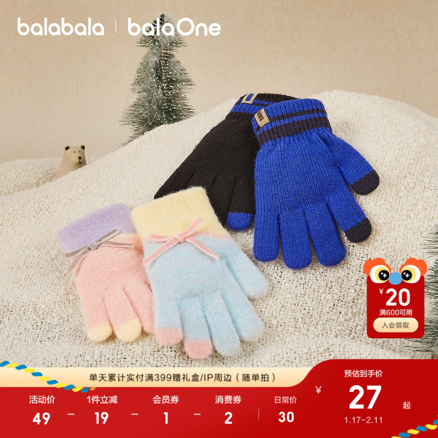 巴拉巴拉儿童手套男童撞色五指2025新款保暖舒适时尚女童冬季亲肤