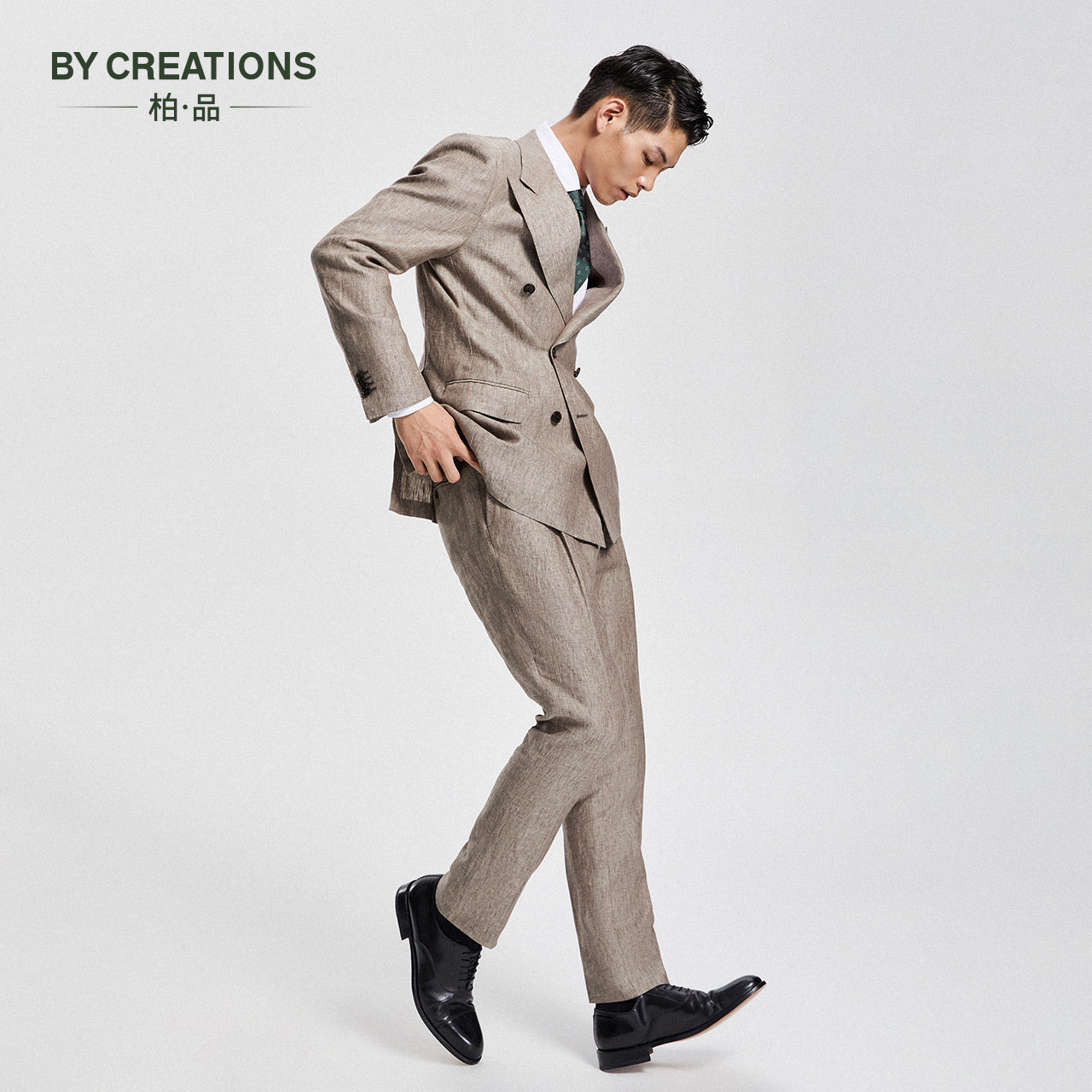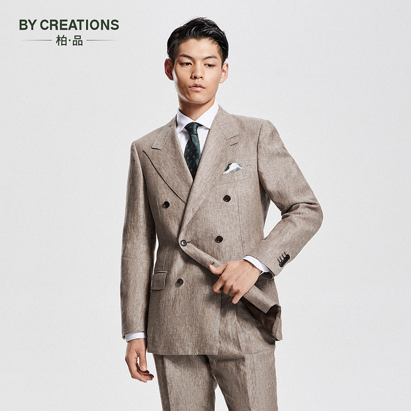 柏品纯亚麻双排扣商务西服套装男秋季透气凉爽正装职业结婚西装
