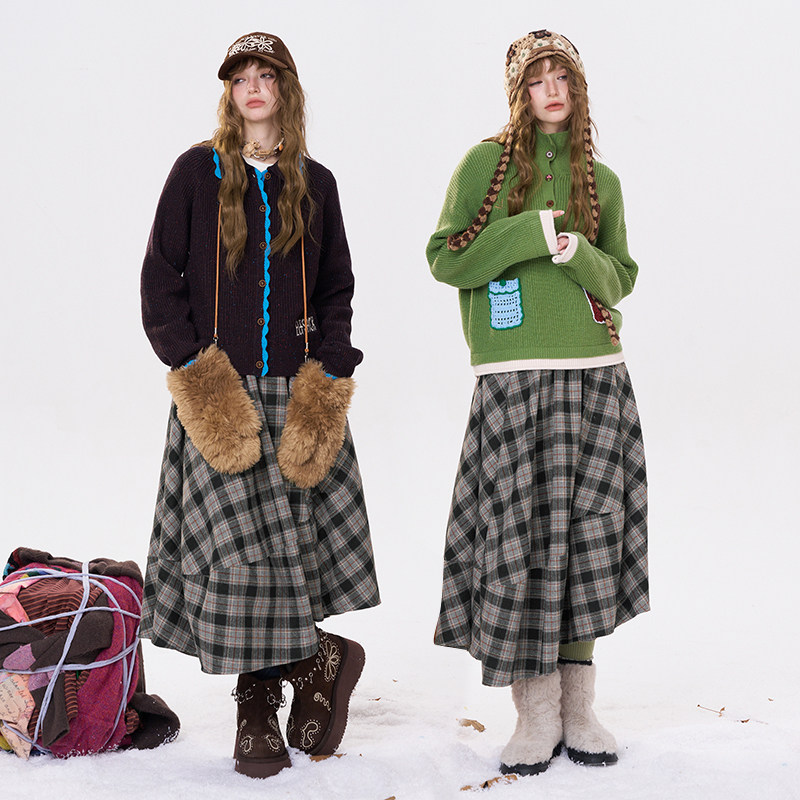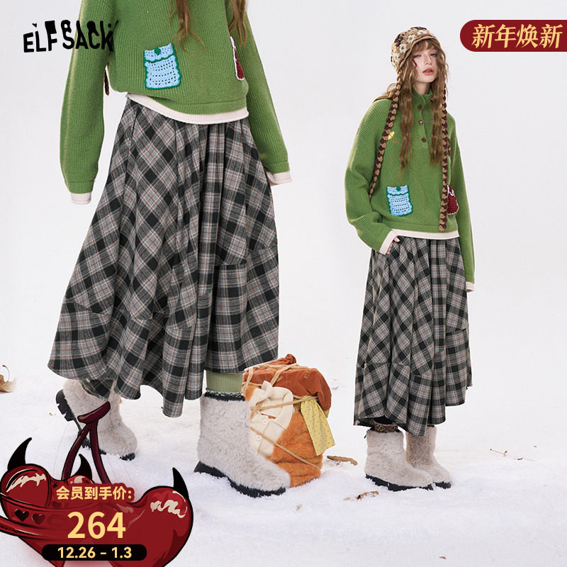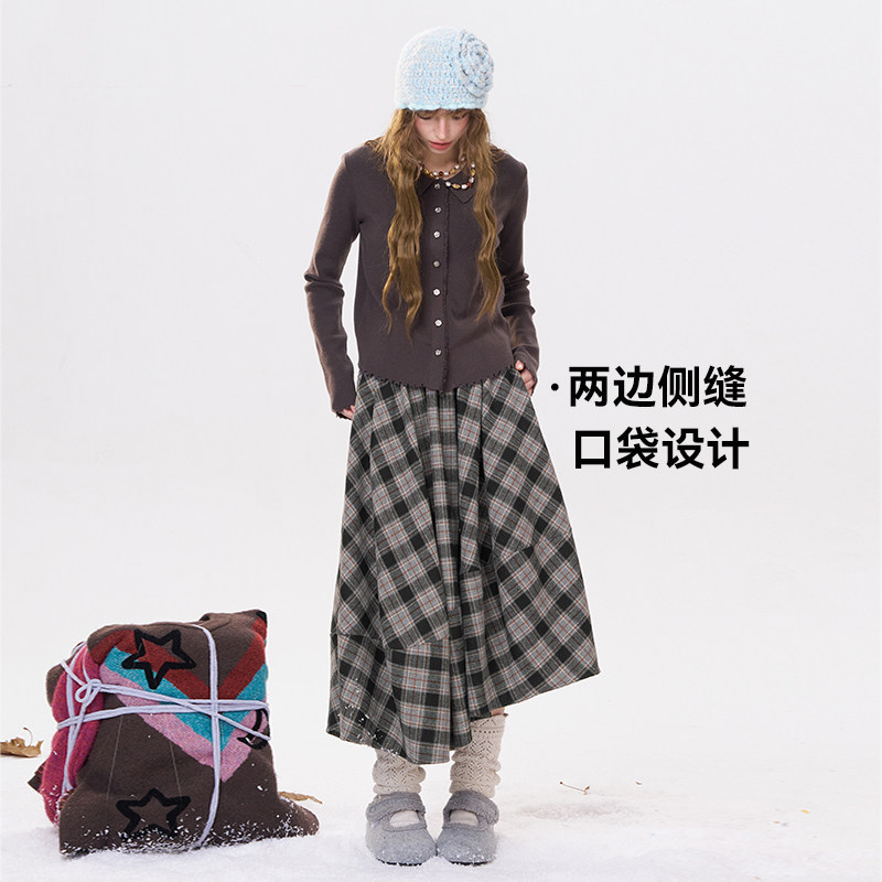 妖精的口袋花苞大摆复古格子半身裙女2025年冬新款中长款休闲裙子