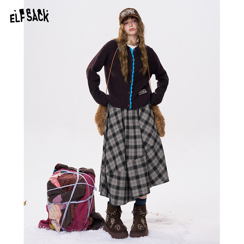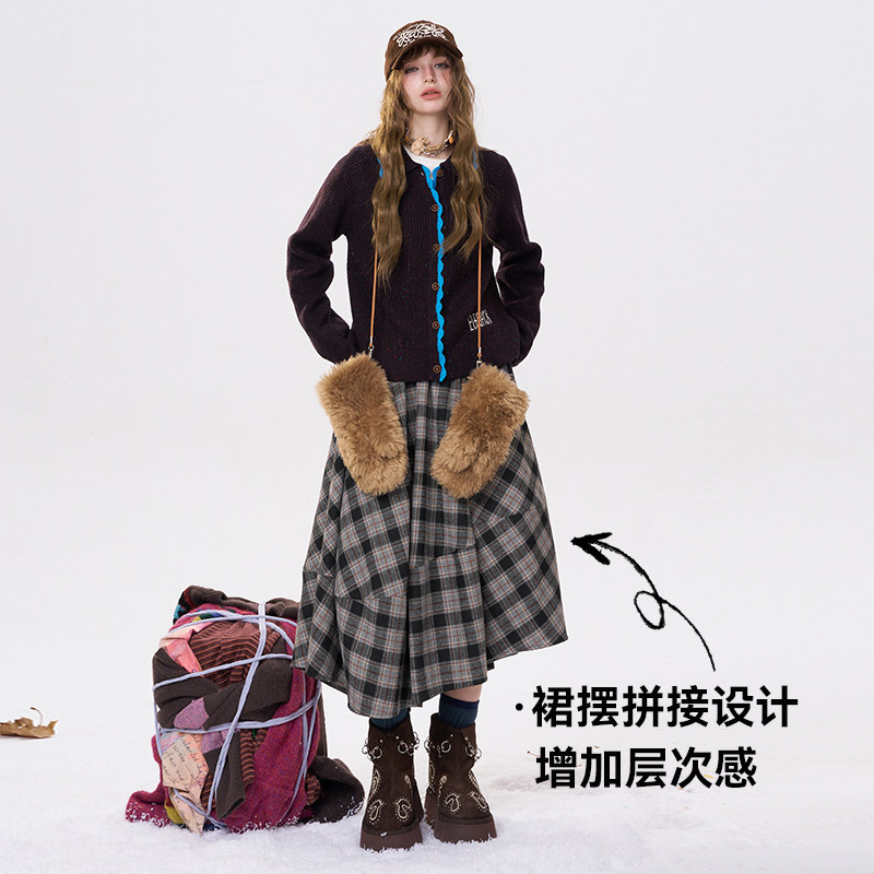 三福格子长裙女2025新款冬季气质流苏摆不规则半身裙子女装509092