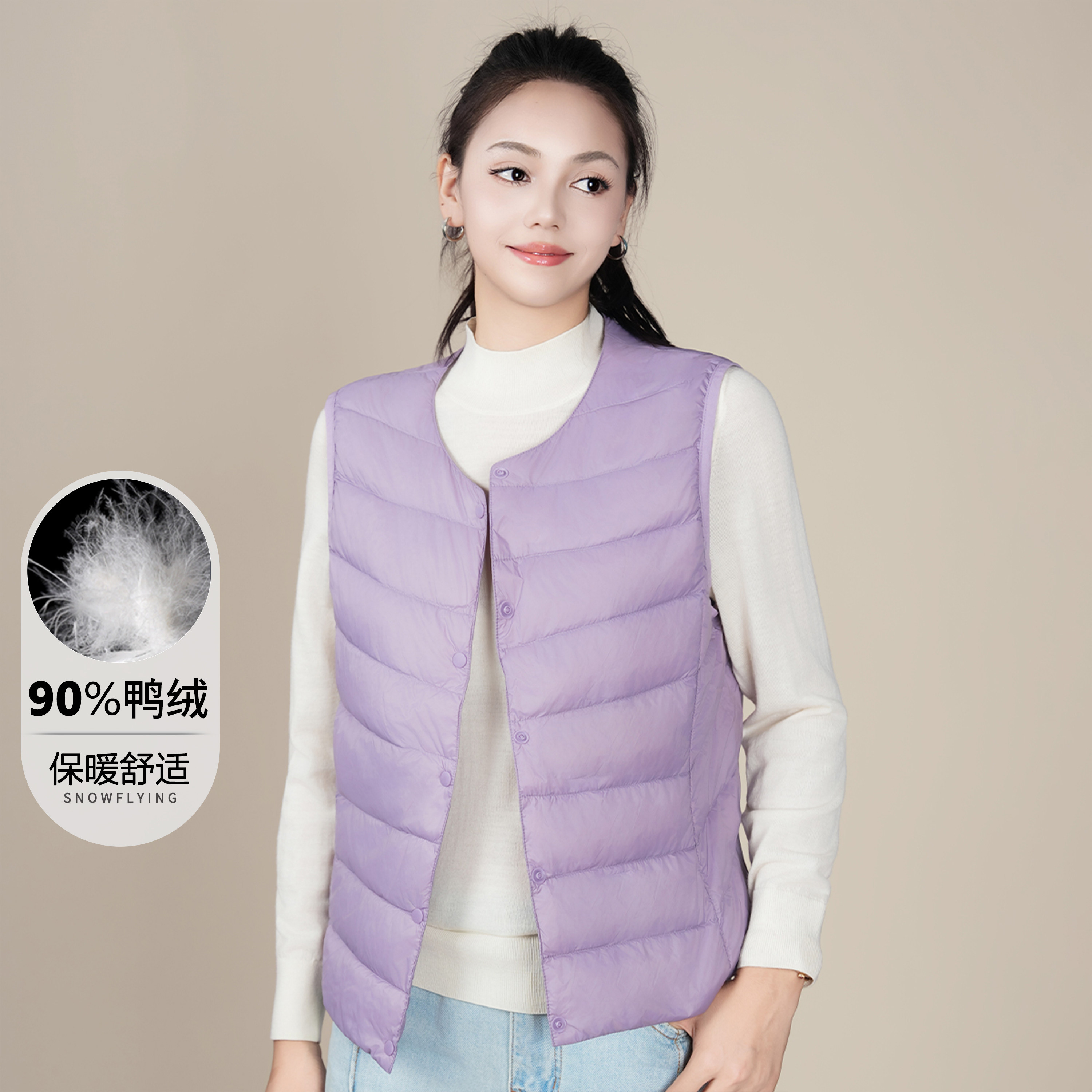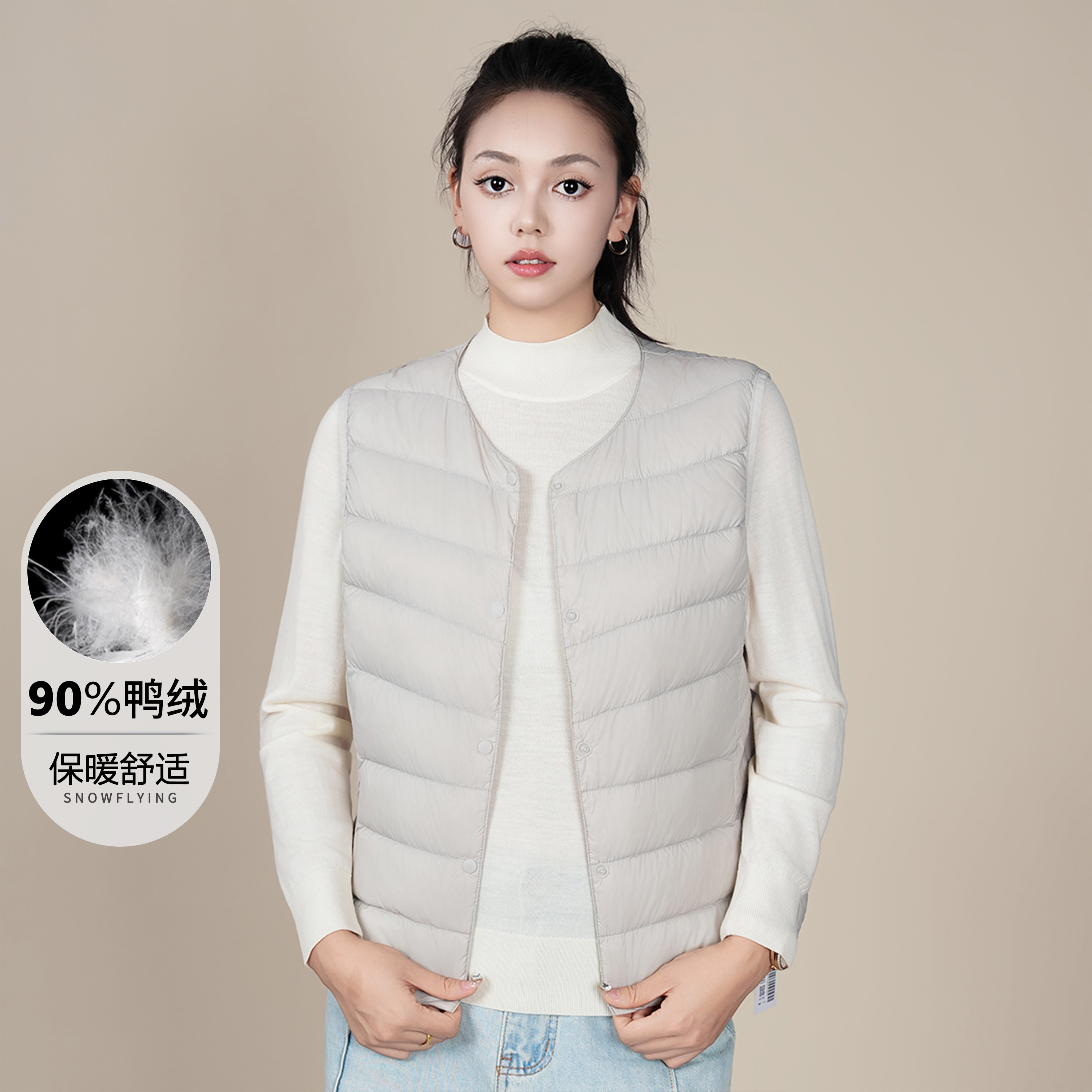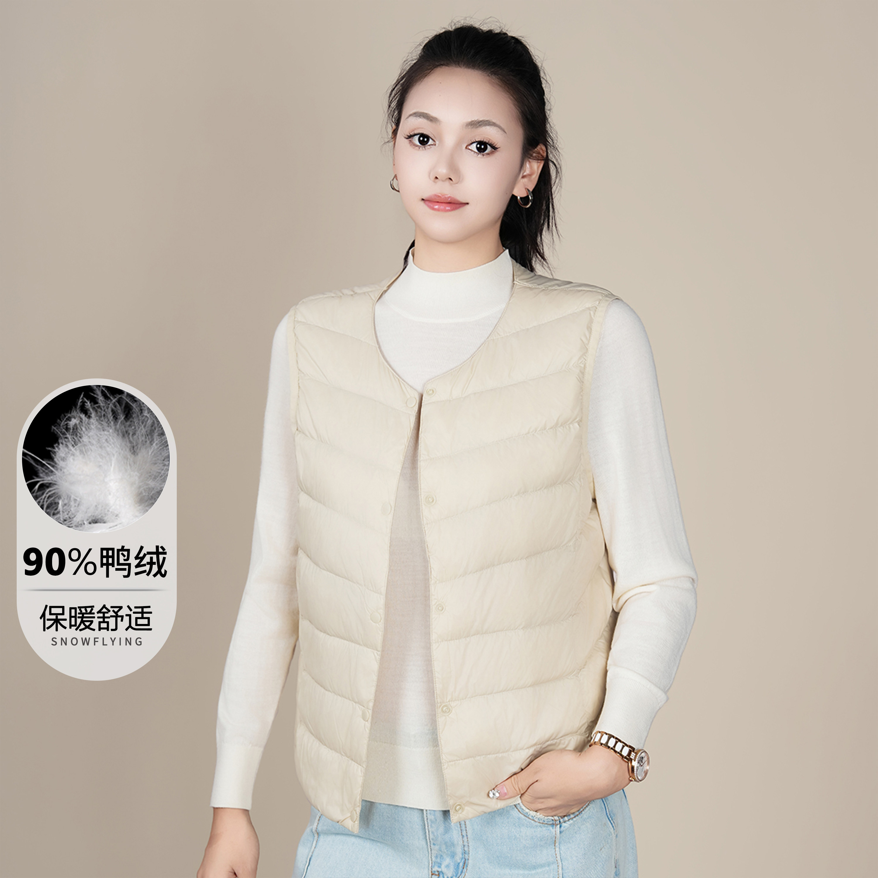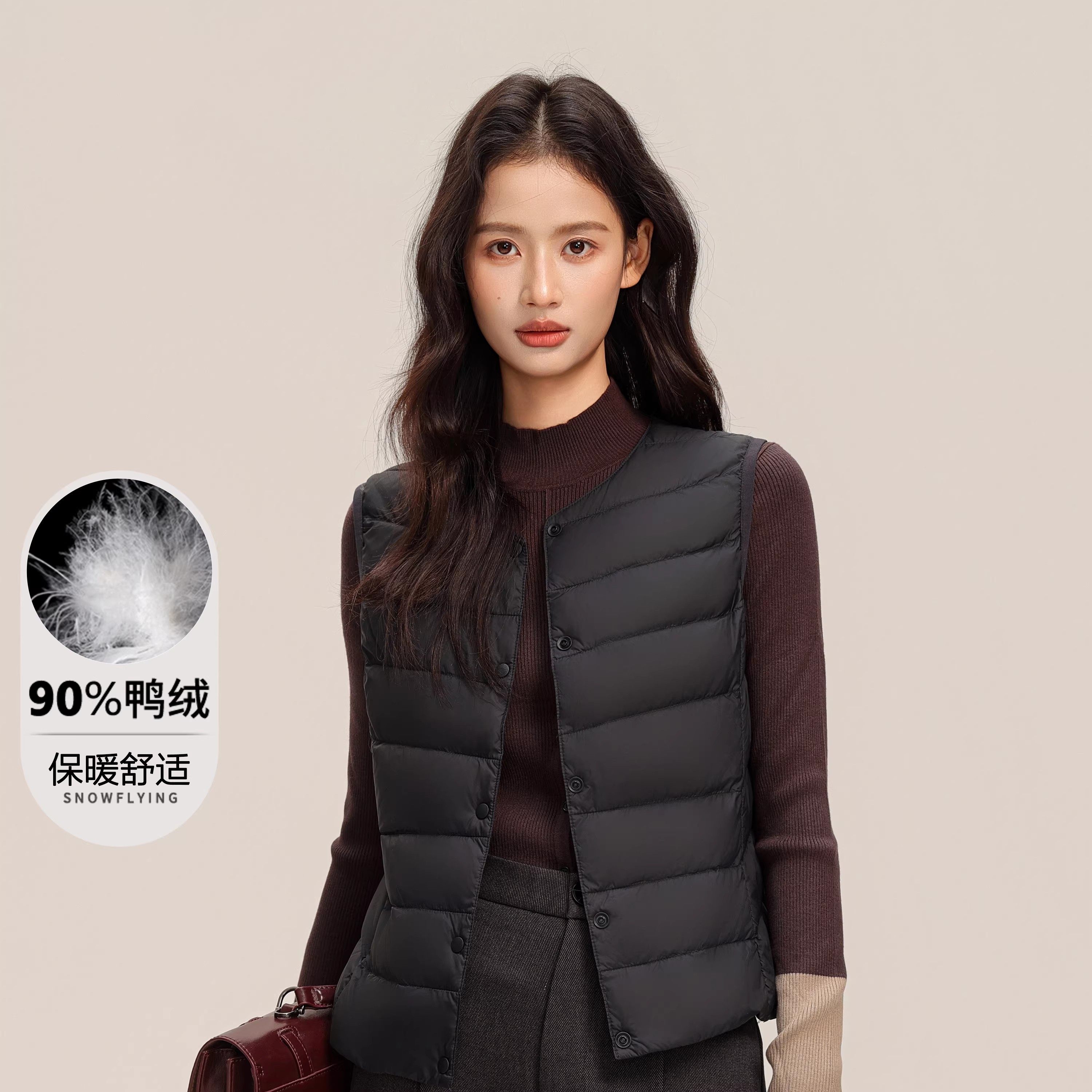 鸭鸭轻薄羽绒服马甲女秋冬季V领基础修身背心内胆鸭绒马夹短外套