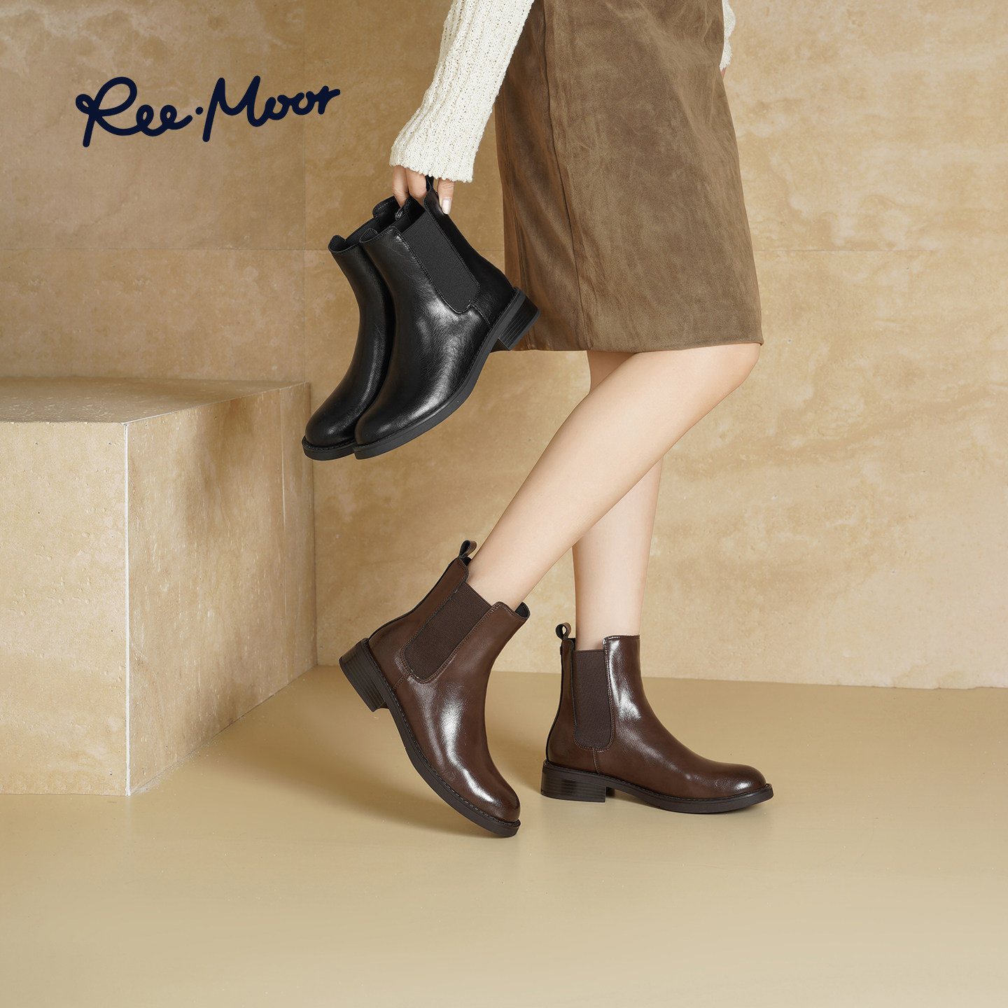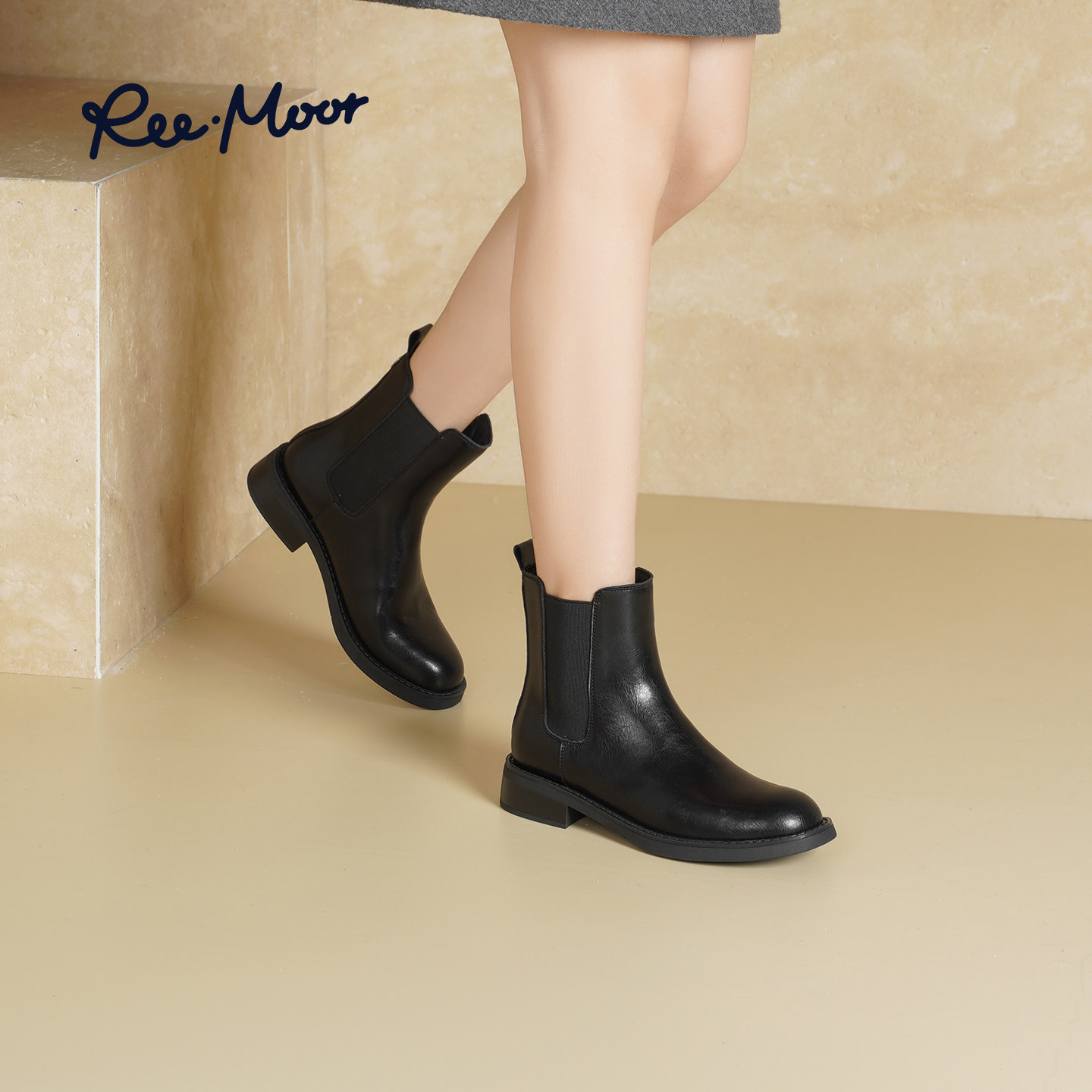 REEMOOR2025冬季新款复古英伦风圆头粗跟厚底增高时装靴女鞋