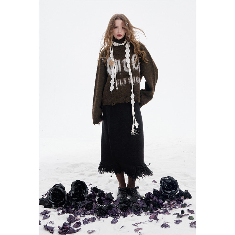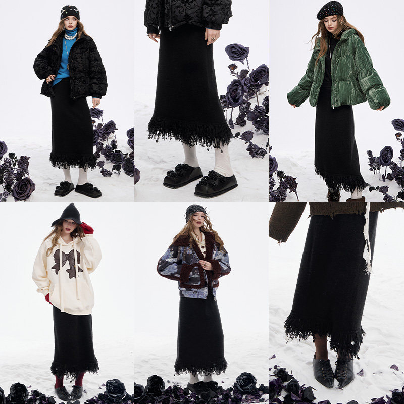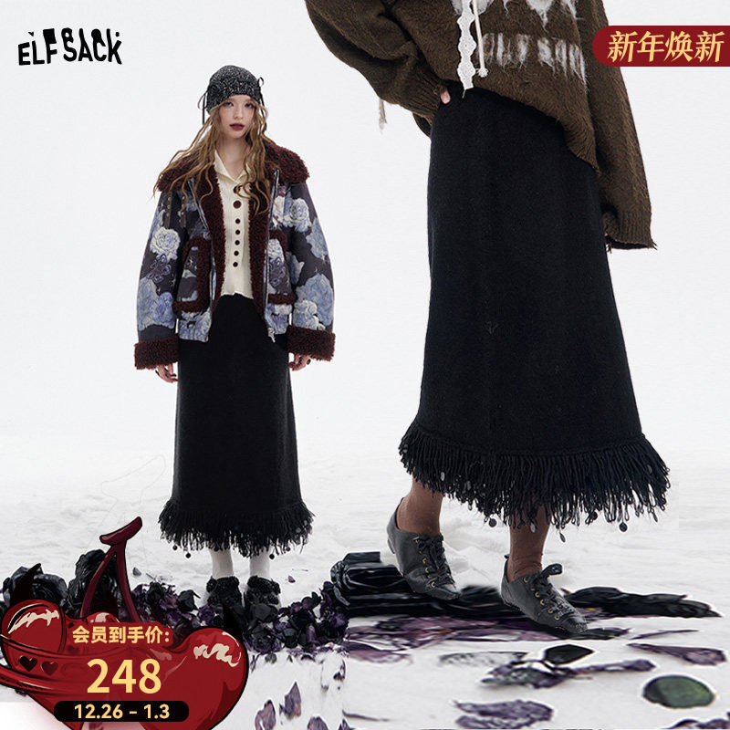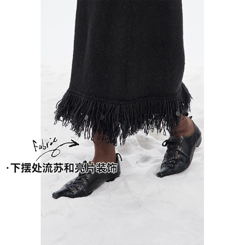 妖精的口袋流苏亮片拼接半身裙女2025冬季新款黑色针织绵羊毛长裙