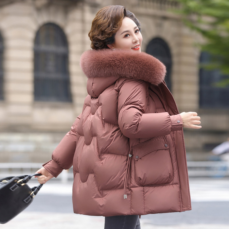 雪中飞2025冬新款女士妈妈款中长羽绒服连帽狐狸毛领保暖洋气潮