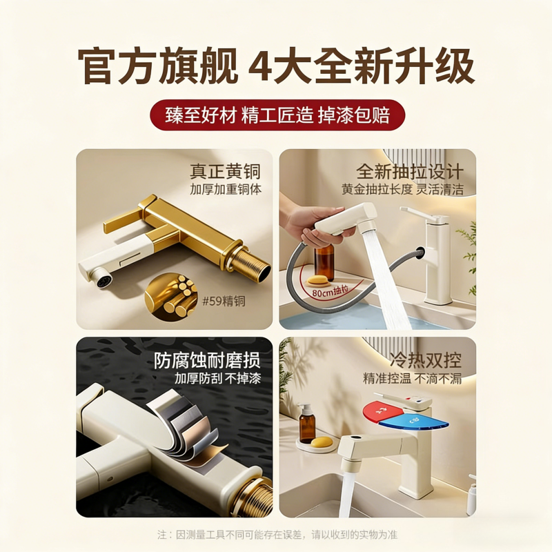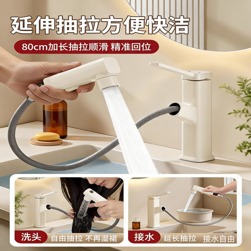 法式奶白洗脸盆水龙头家用浴室柜台盆抽拉式冷热面盆洗手池奶油风