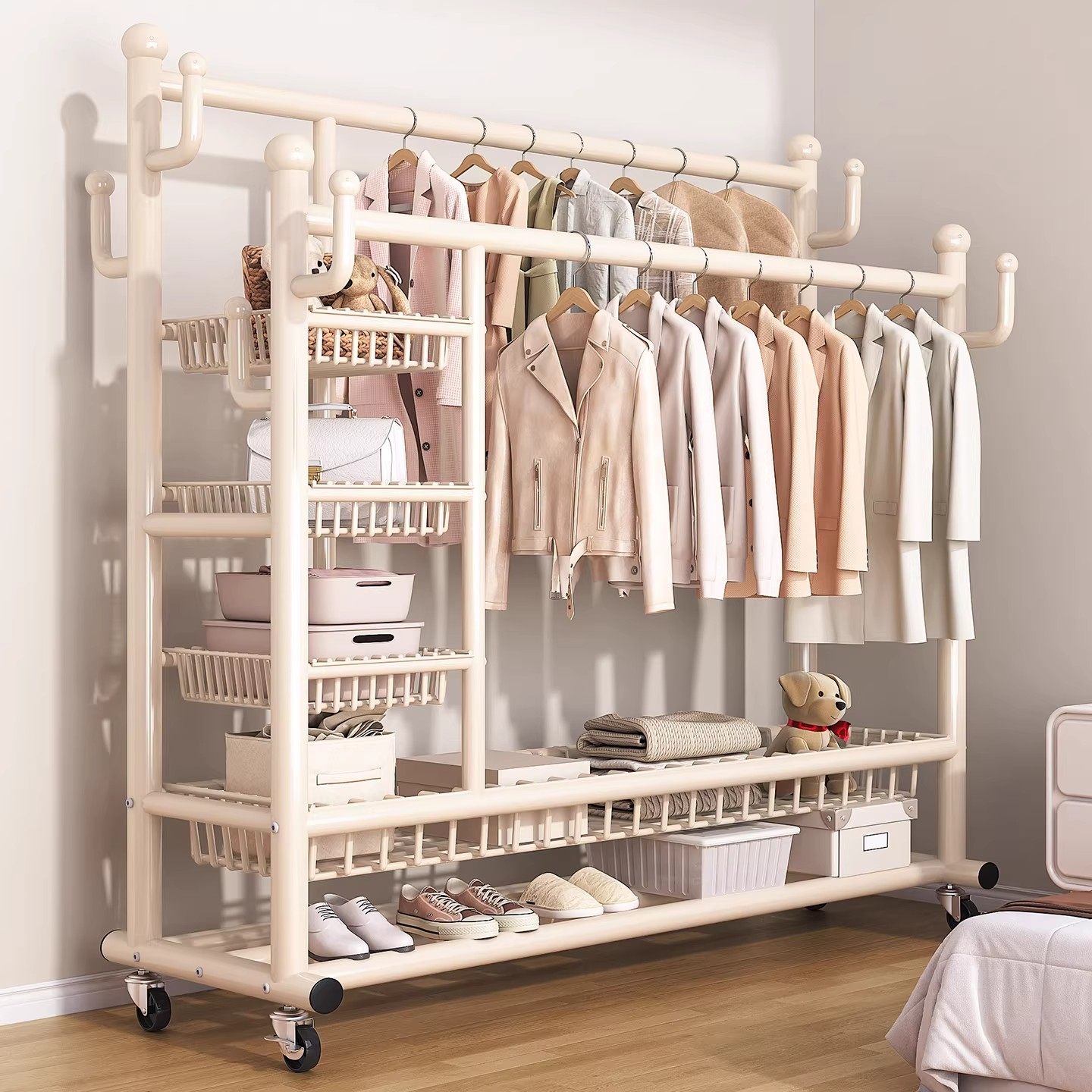 衣架落地卧室奶油风挂衣架家用铁艺简易晾衣架室内客厅移动衣帽架