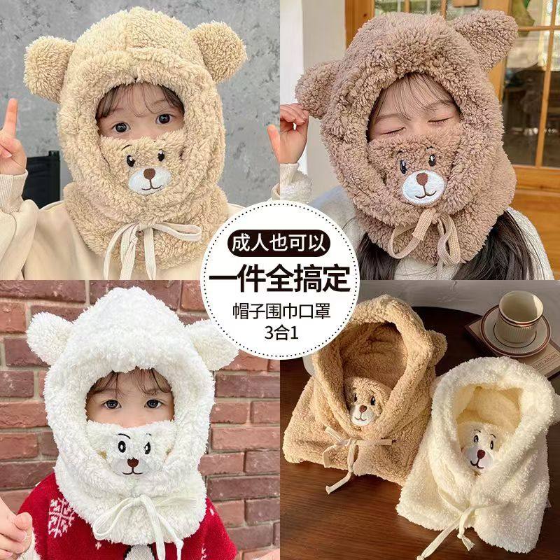 儿童帽子加绒男女童口罩护耳帽冬季骑车防风帽三合一头套防寒护脸