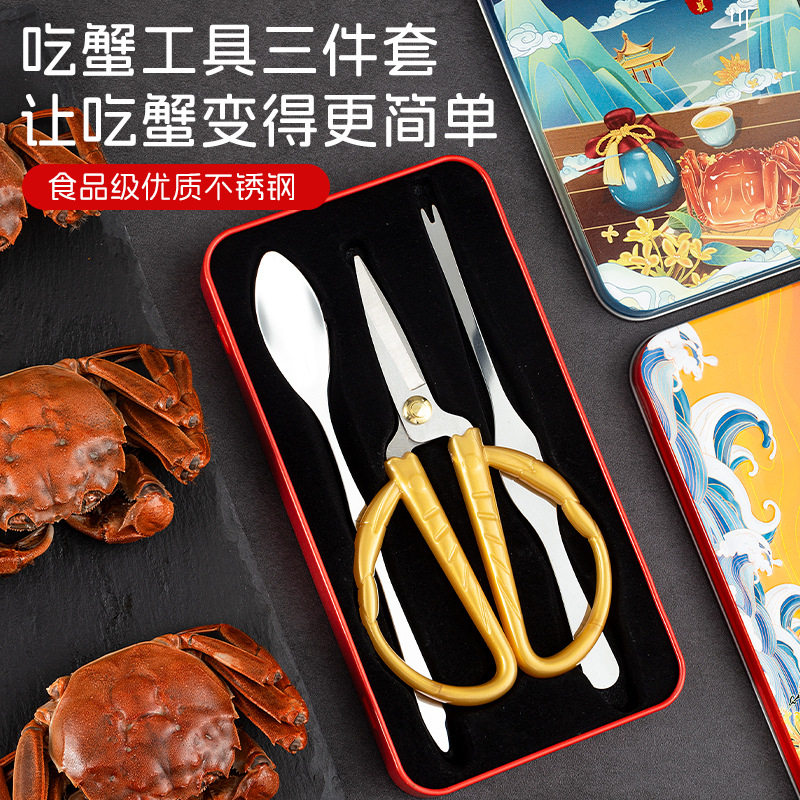 吃螃蟹专用工具三件套蟹铁盒家用拆剥大闸蟹套装蟹钳夹针剪刀神器