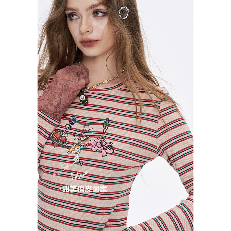 妖精的口袋趣味印花长袖t恤女2025冬新款新年战袍打底衫红色上衣