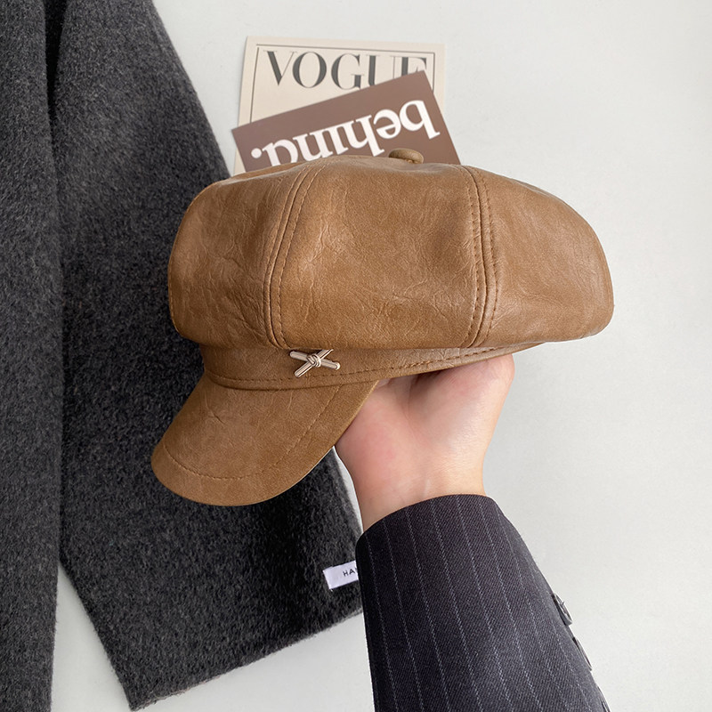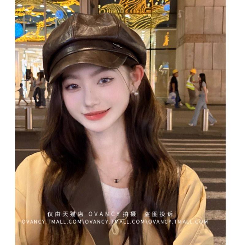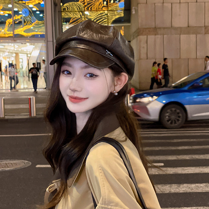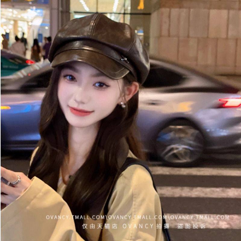 2025新款PU皮质八角帽女海军贝雷帽英伦复古报童帽卡其色咖啡色